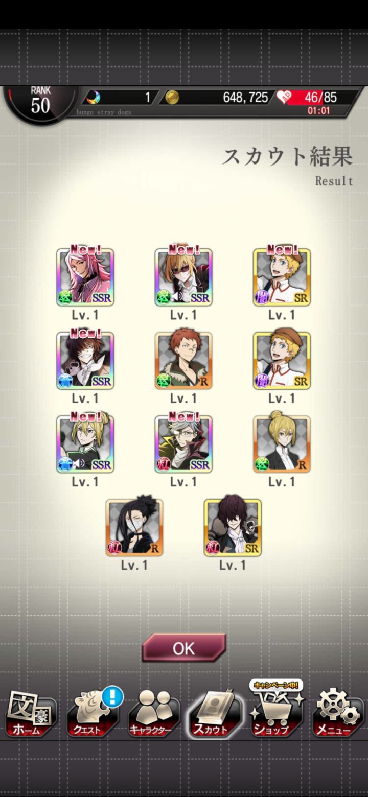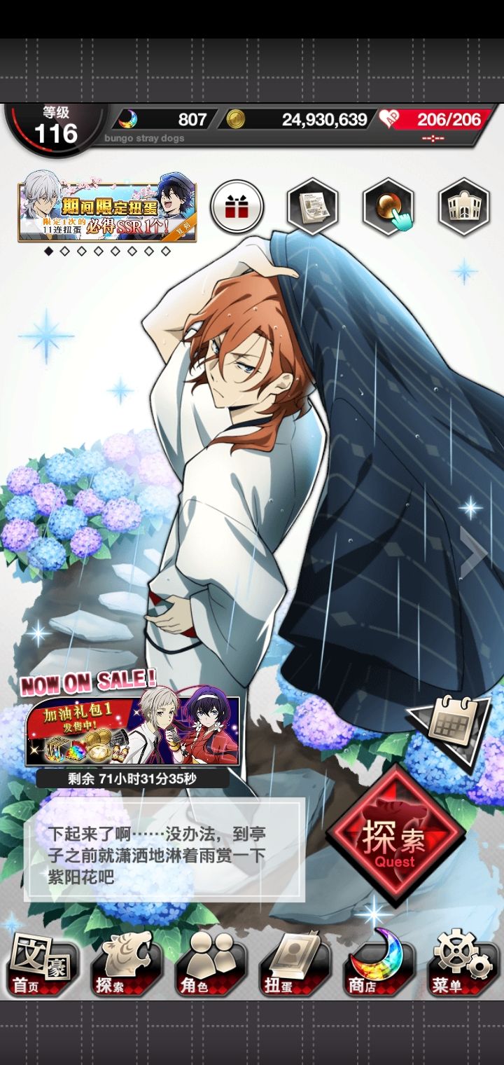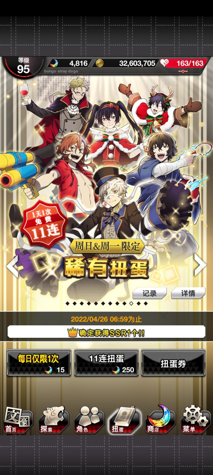 爽啦,刚开始玩,只要出ssr就是双黄辣个正装池子我怕浪费石头犹豫了好久,结果第一发就出啦!两个都到手啦!我哭了第一次被抽卡游戏这么友好的对待这个爆率是真的可以我永远喜欢文豪野犬呜呜呜上面是0405我真傻,断过月见黑的人怎么会突然变欧呢这是新 人 诈 骗啊