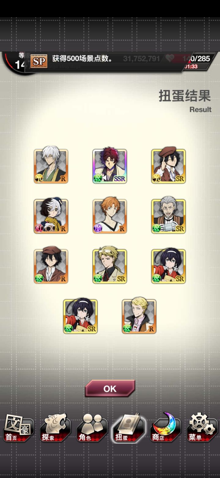 这次抽卡好欧啊抽完S6,就S4没有抽到SSR捅了那么多只窝,就是不给我抽到敦仔啊(´;︵;`)