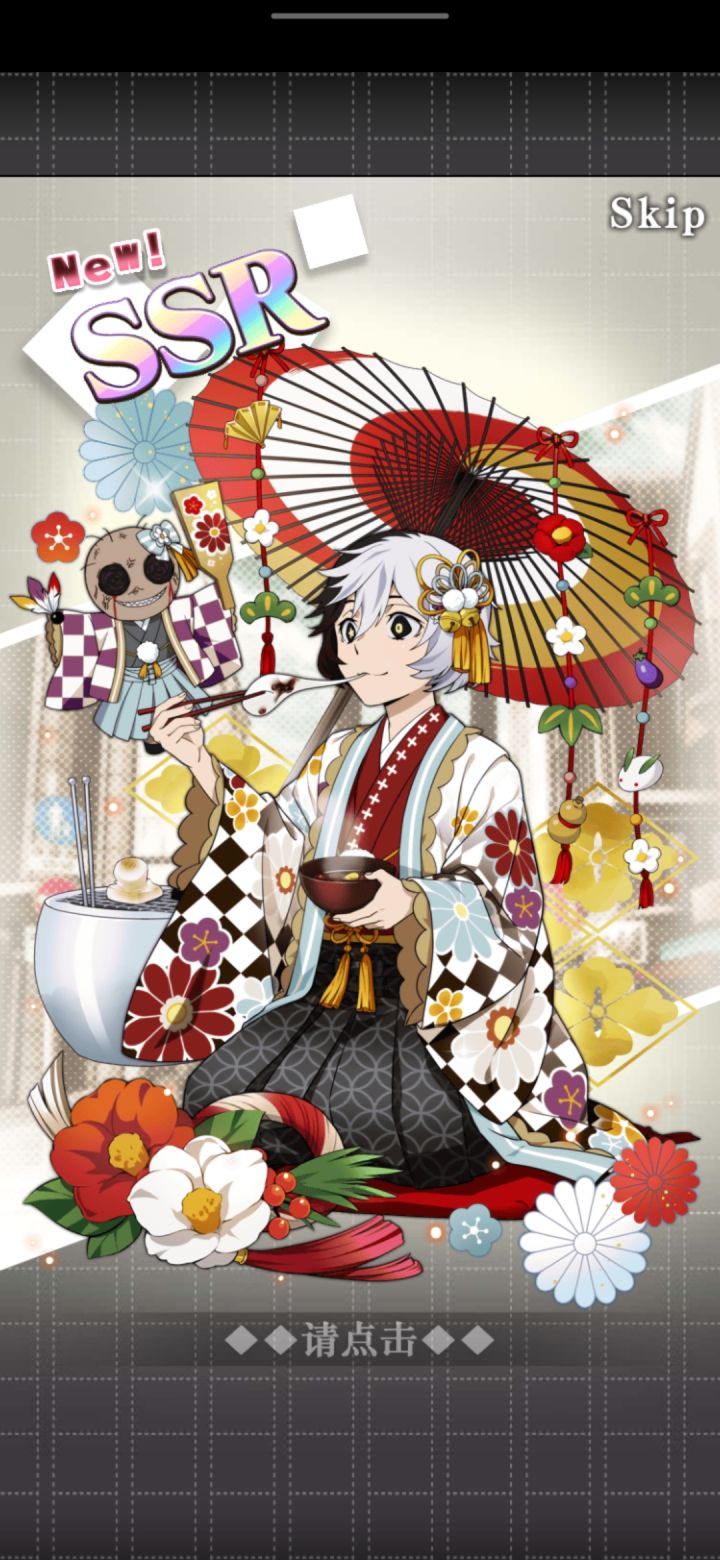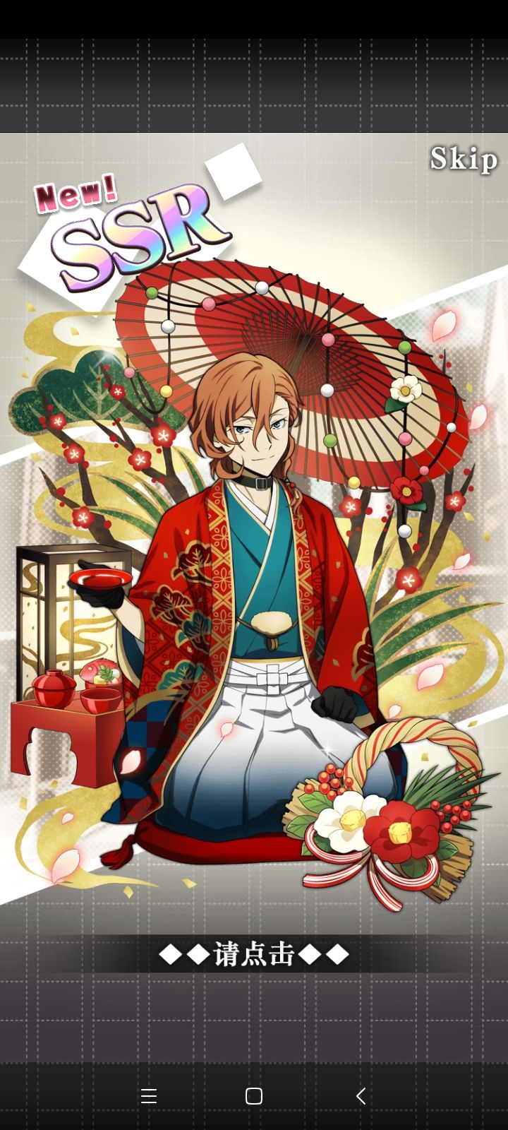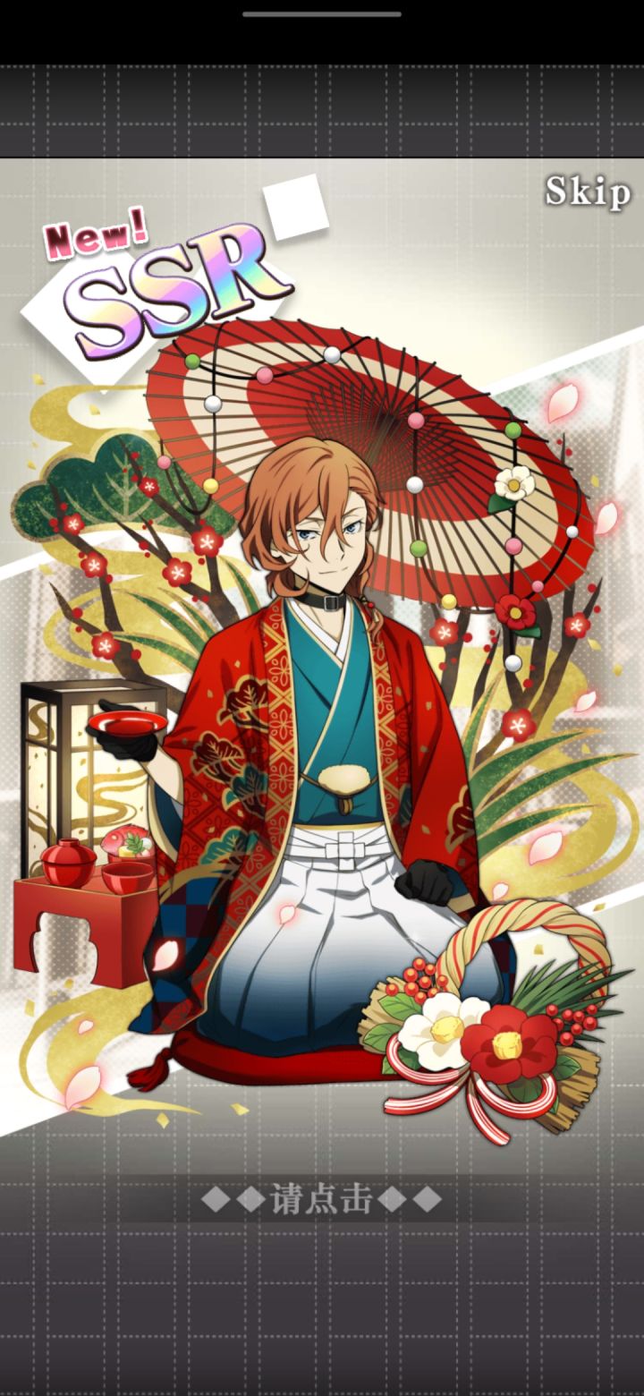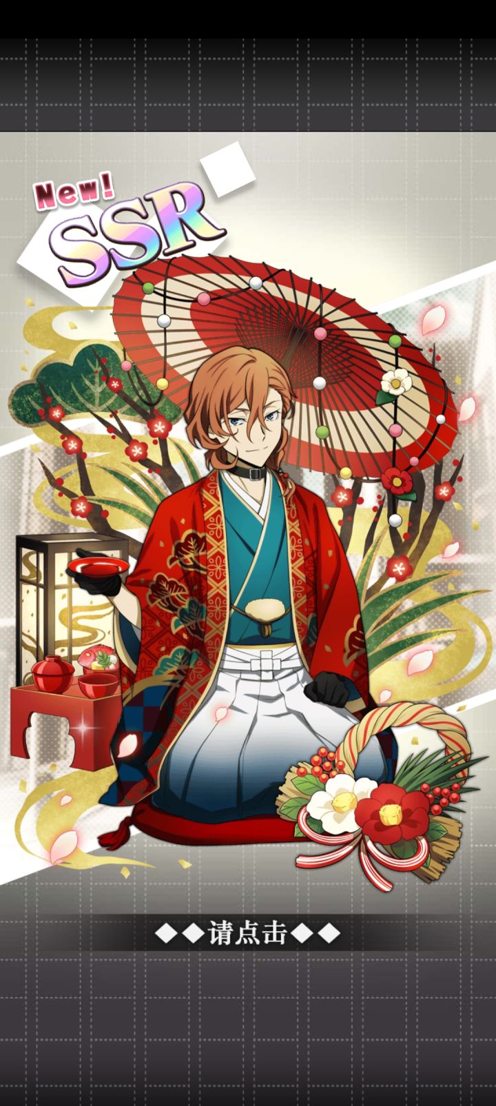 新池免费十一抽出了中也,新春的复刻池抽了八十抽了快一张ssr也没有,每天在激吹和躺平间徘徊。以及中也新卡好好看!中也厨狂喜