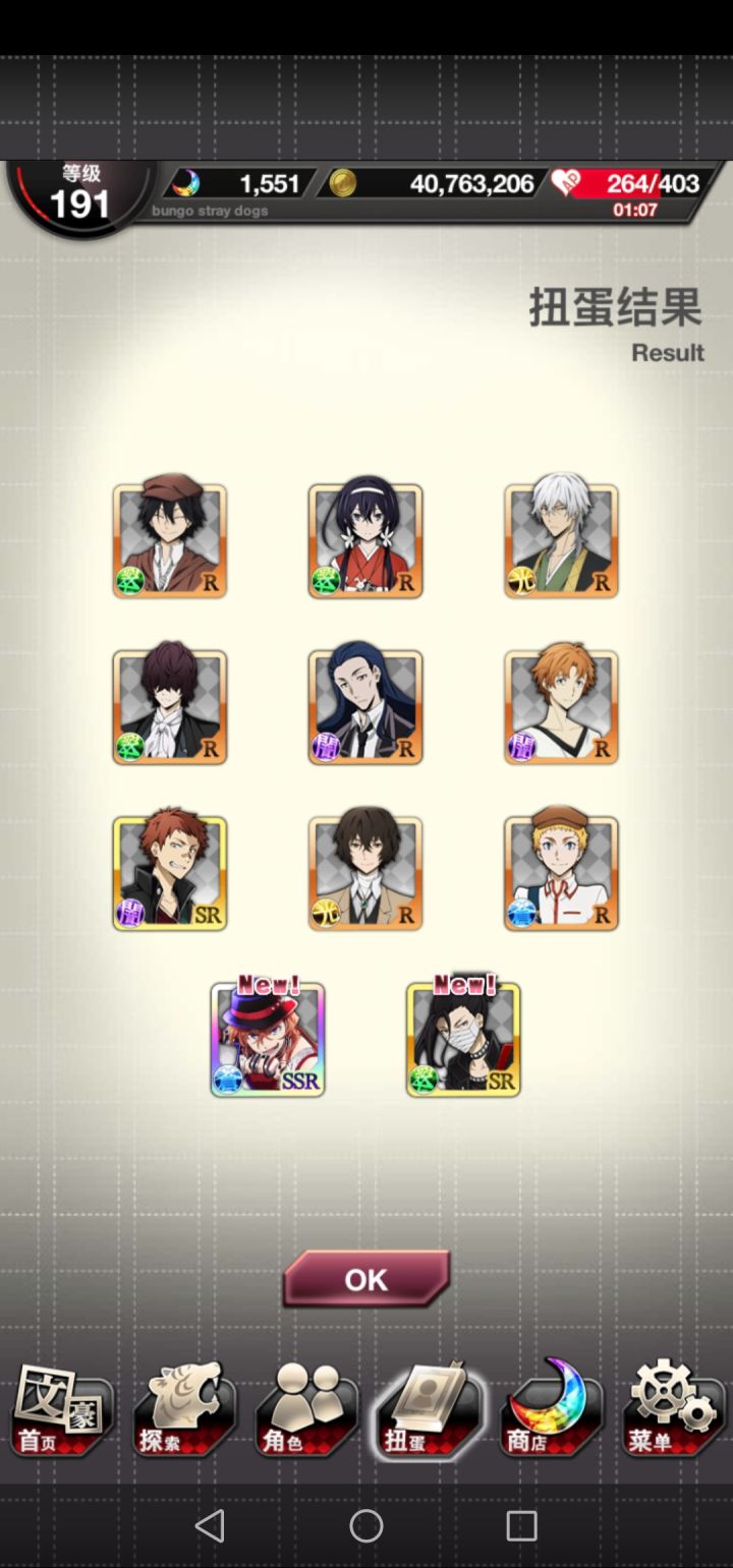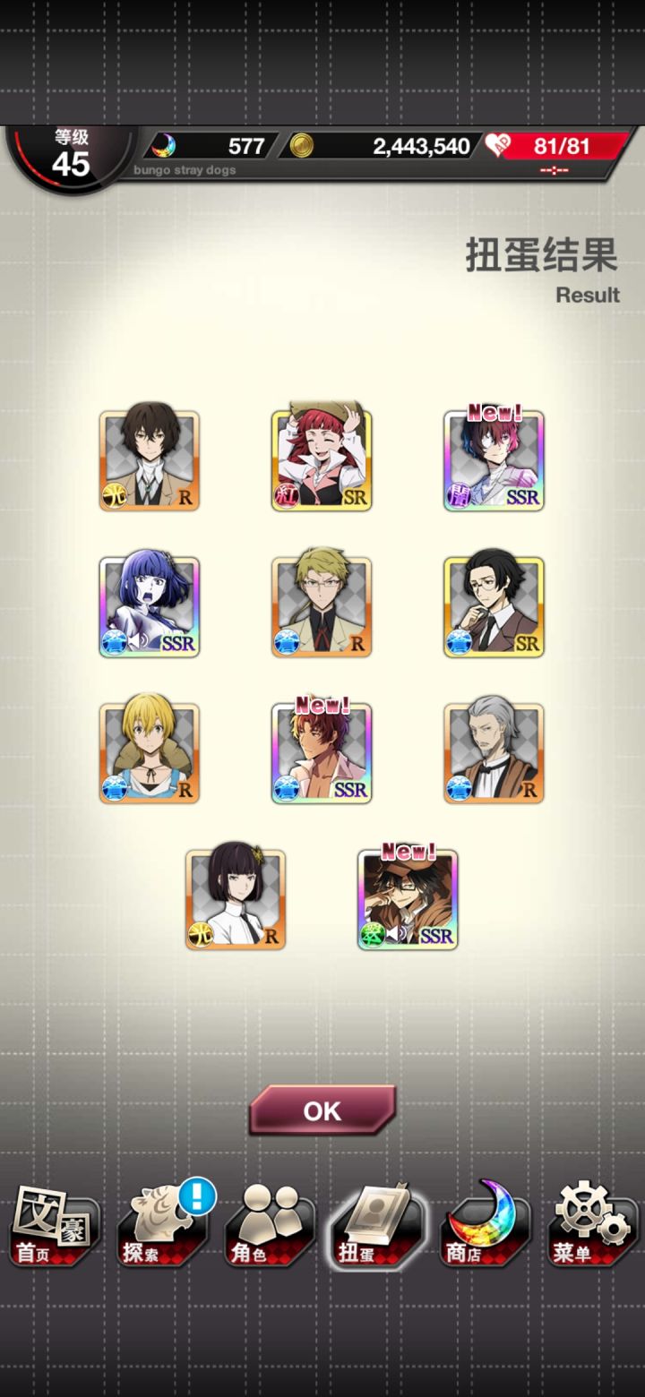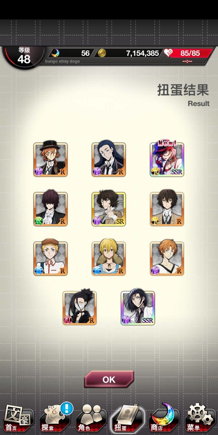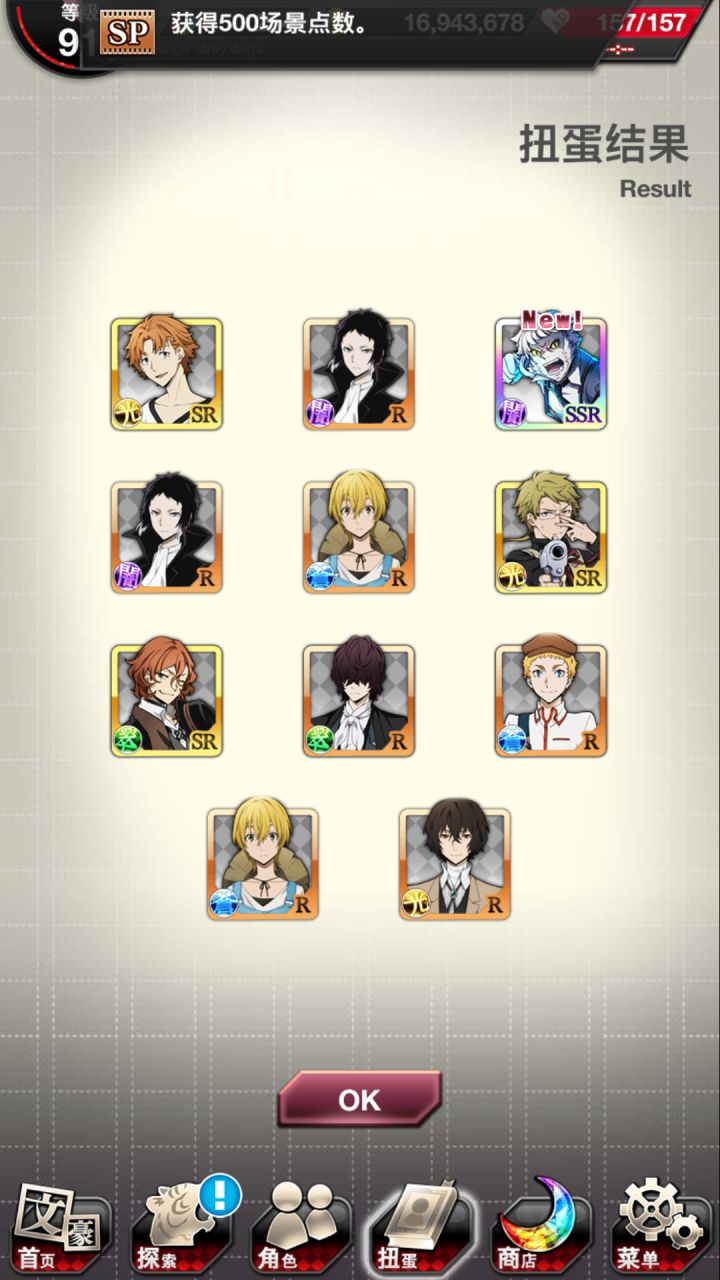 别问,问就是我的心在哗哗地流血。一个518下去以后,抽三次出了7张ssr。。。我开始相信钞能力了눈_눈还有一张图没截(因为是重复的ssr),不过总算是强娶了新年卡池的四位文豪大人