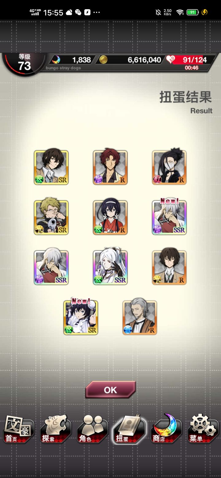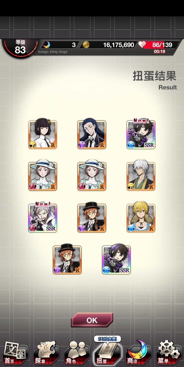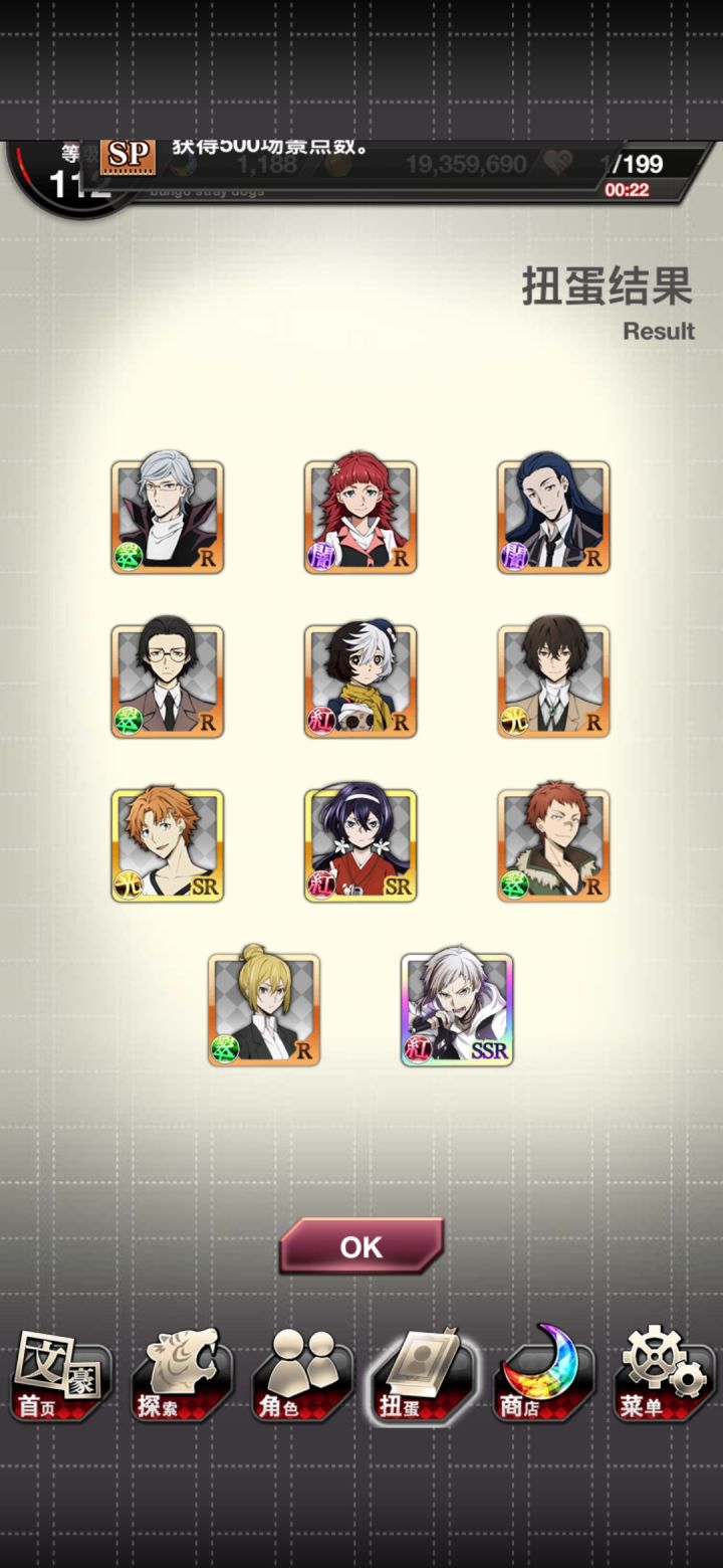 我……两次十连四个SSR但是没有一个是织田(但是三黄蛋还是要纪念一下)开服萌新,不肝不氪,活动的话也只关注织田的活动,但是!我!每次活动都没有织田!哭了,其他角色的话,就凭我这个佛系程度,好像也是挺欧的了,但是就是完美避开本命。还好有涩泽和芥川支撑着我