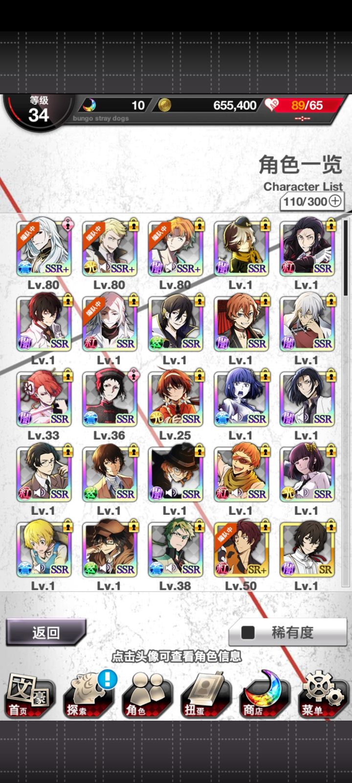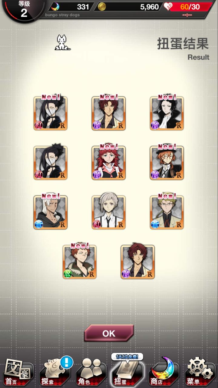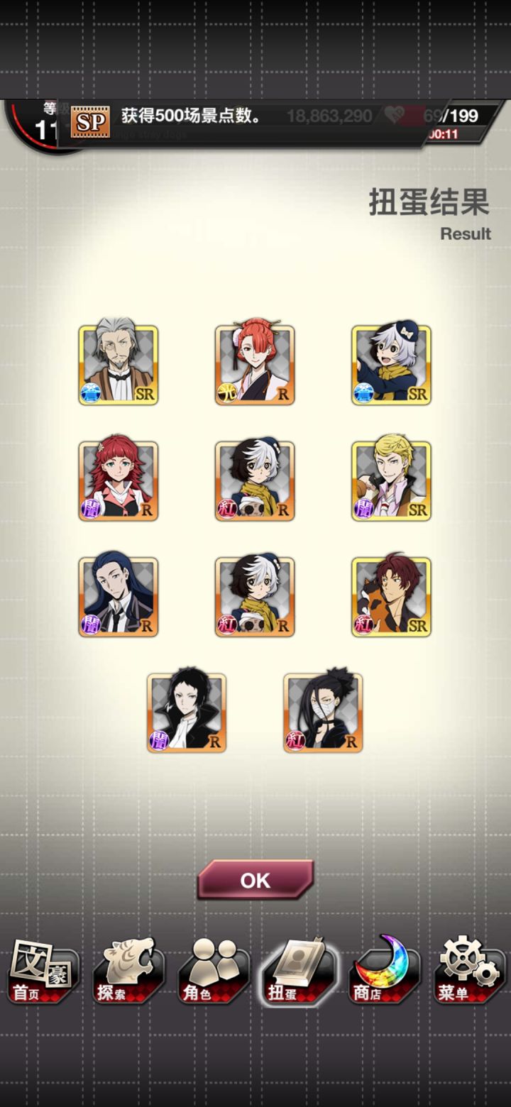 我……两次十连四个SSR但是没有一个是织田(但是三黄蛋还是要纪念一下)开服萌新,不肝不氪,活动的话也只关注织田的活动,但是!我!每次活动都没有织田!哭了,其他角色的话,就凭我这个佛系程度,好像也是挺欧的了,但是就是完美避开本命。还好有涩泽和芥川支撑着我
