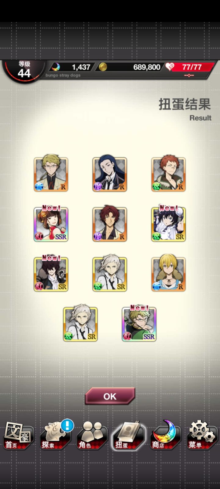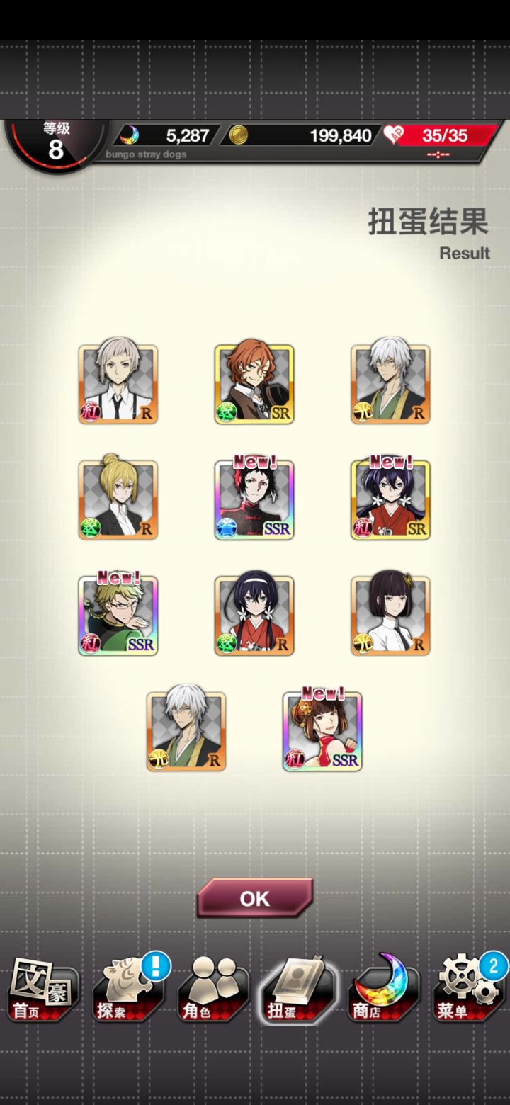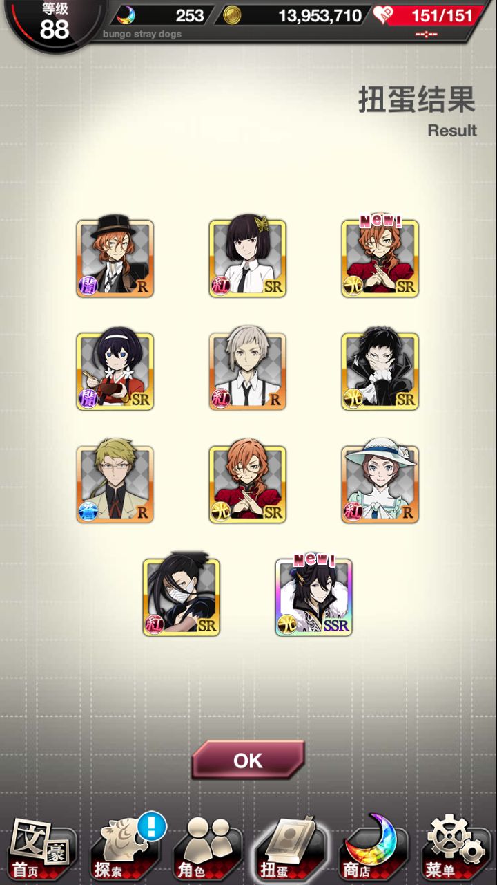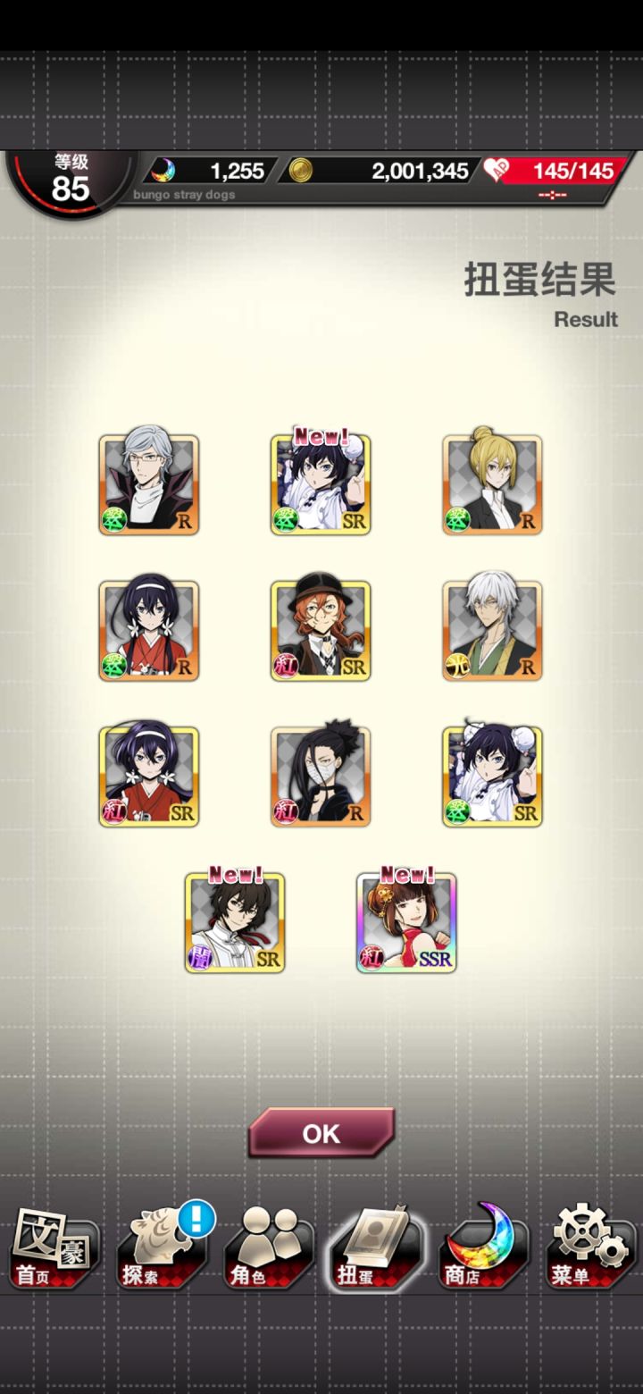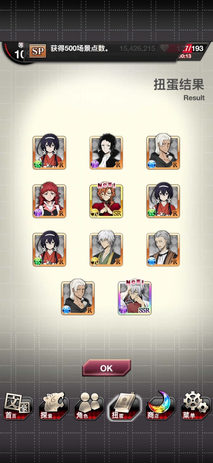 总之就这样,阶段池六发十连,就,看起来不错甚至有三ssr一发,但是我上去抽完想起来翻翻池子内容。。。然后发现我一个中华中也都没有,啊这,就,之后我抽掉了十九张券,然后发现券可以抽到那个池子里面没有中华中也,而同样是srup太宰治和泉镜花都差一个就满了。。。之后我肝了一会活动又来了一发十连,就总之,现在中华太宰和中华镜花满了。。。但为什么想要的中也也是sr就一个都没抽到,要说自己非看着十连三ssr