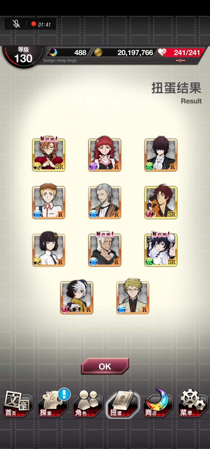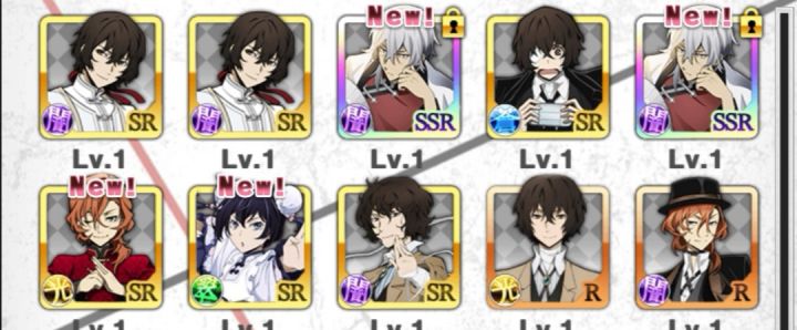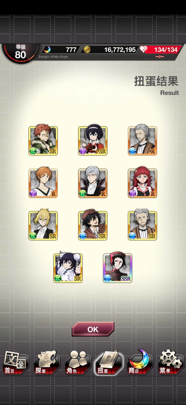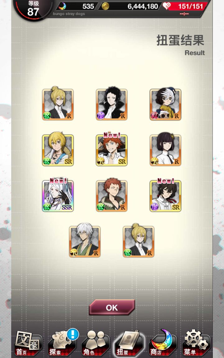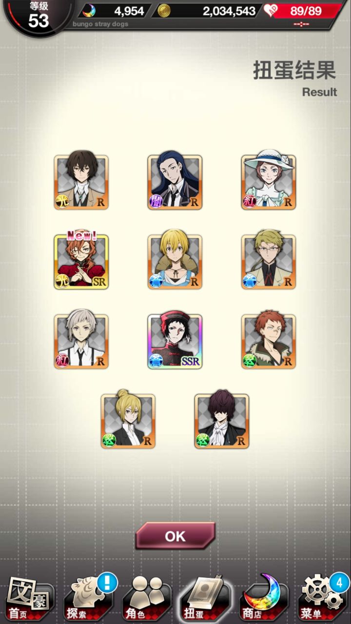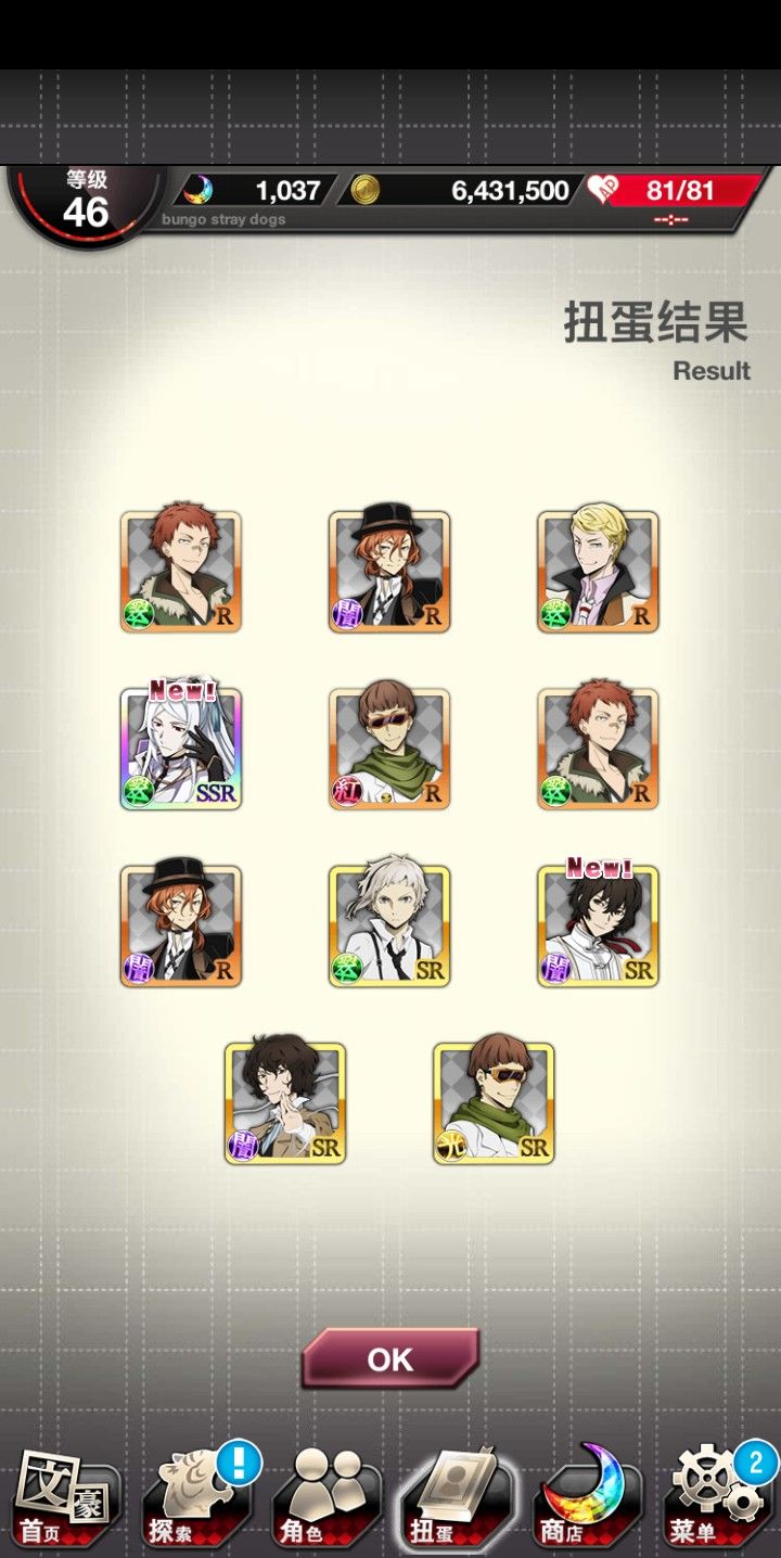 16:00的时候,激动的我,颤抖的手打开了小野犬,在敦敦奔跑了45分钟之后,我终于进去了游戏。平复心情,开始为了美人和陀总献出攒了两个月的月亮。满心欢喜的我,第三阶段双ssr(美人+社长),第六阶段一张没有重复的陀总,这个池子有惊无险的毕业了。当时的我特别高兴的和小姐妹分享了一下,然后……她开始了欧皇的抽卡。(ps:万恶的欧洲人,当初我们手牵手说好一起去非洲,只有你一个人偷渡成功了)