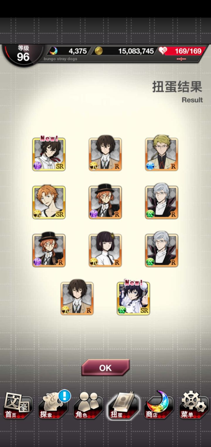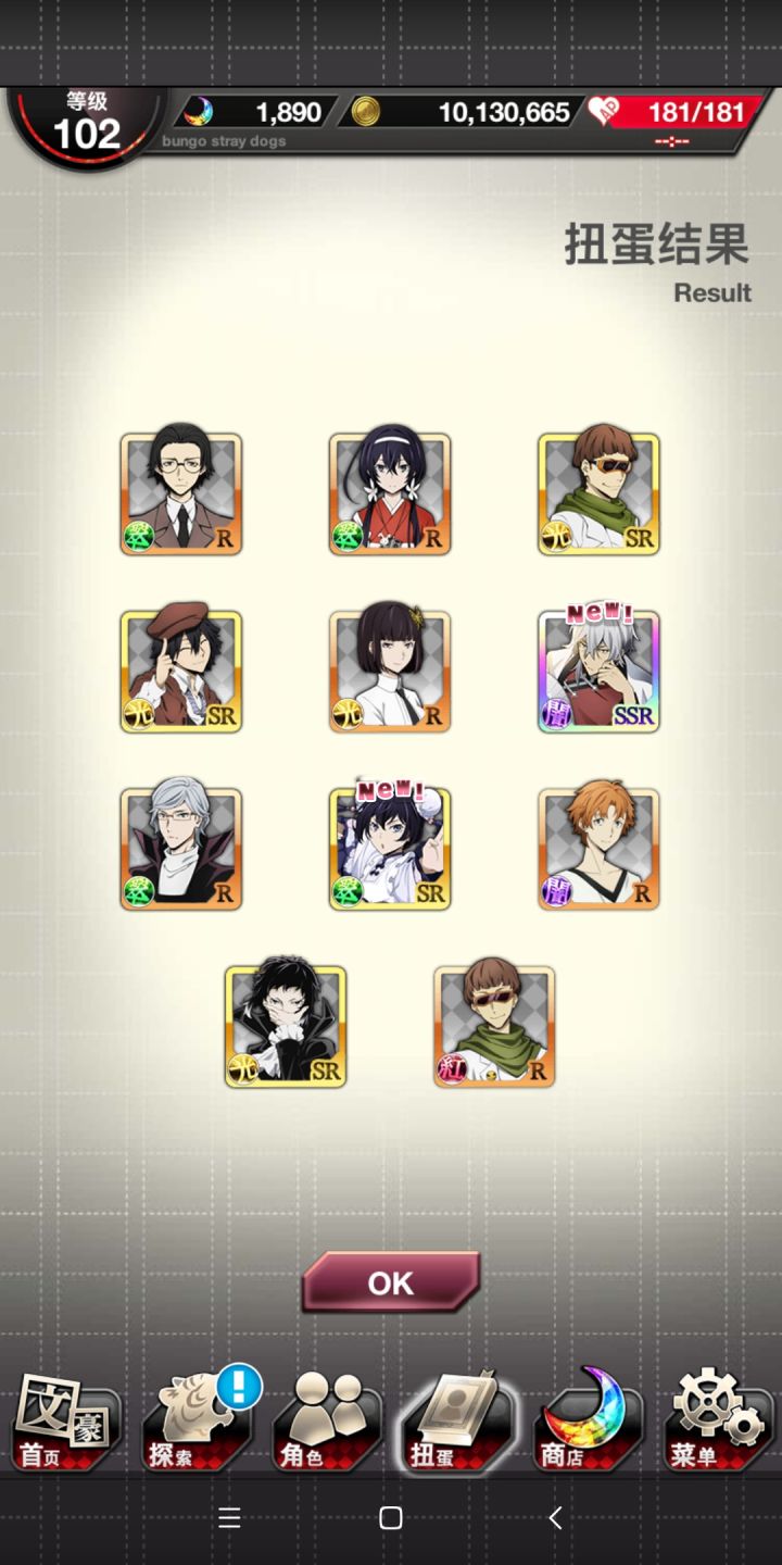 因为上次没抽到中也所以这次准备拼一把结果第一发就出了,还来了个芥川,果然中也最棒了!