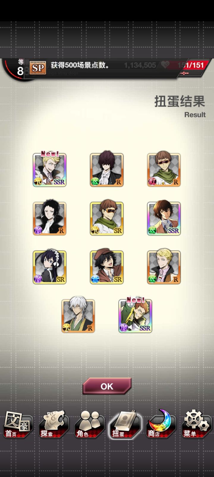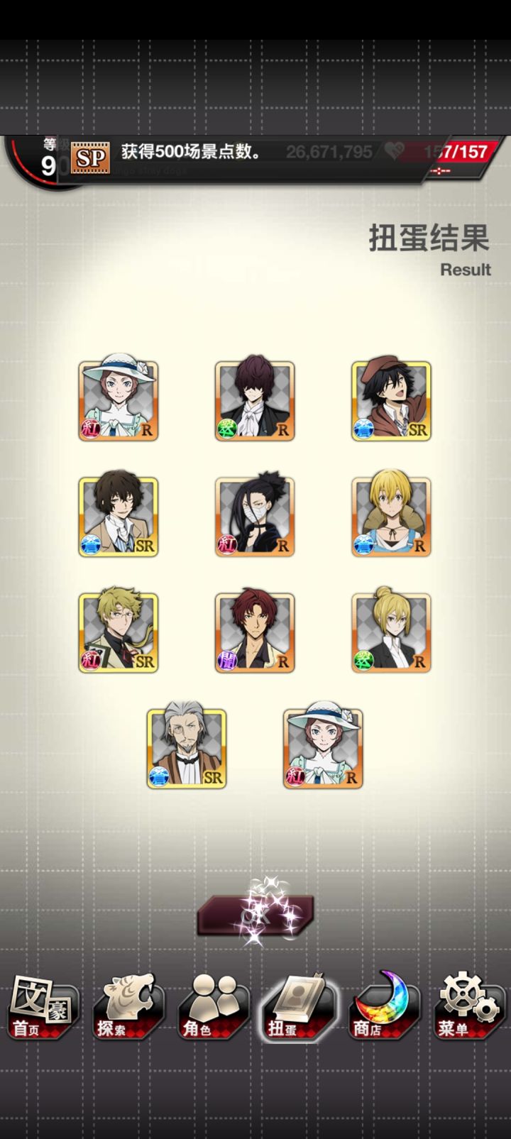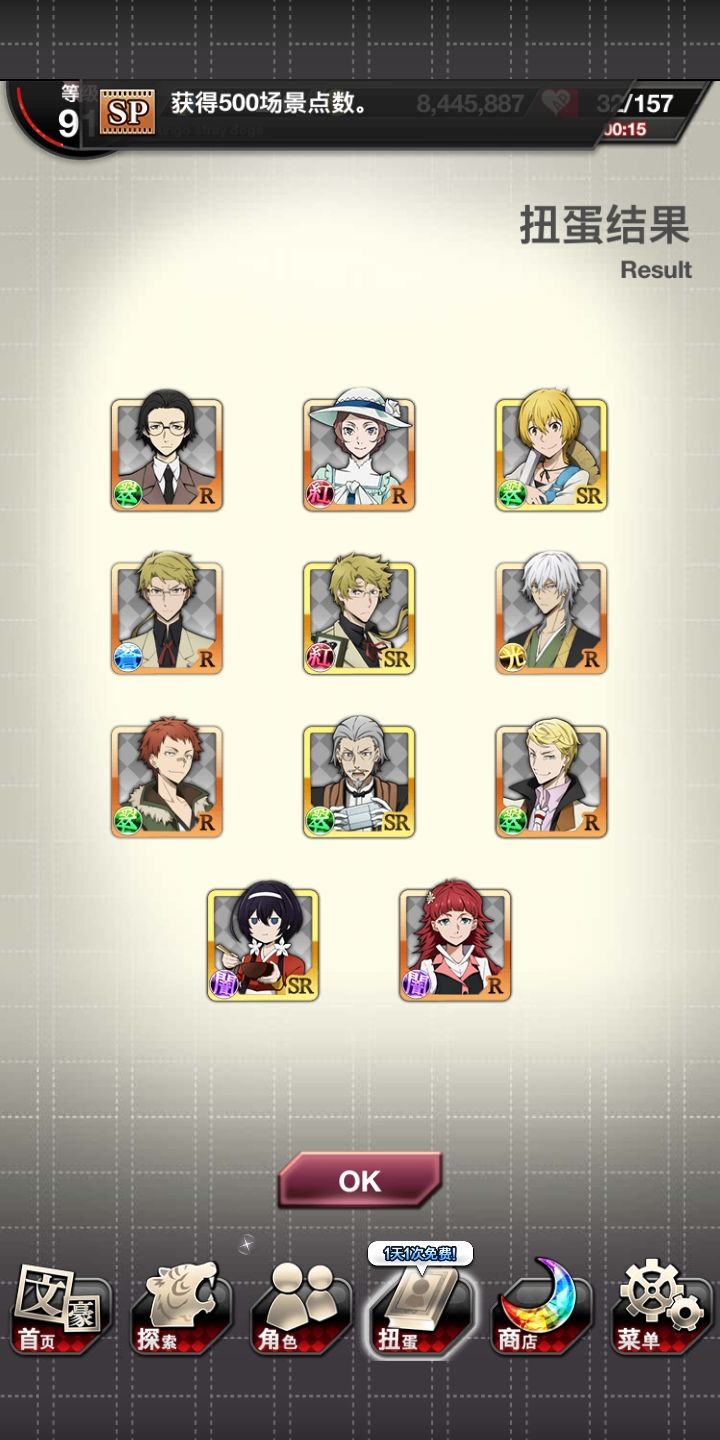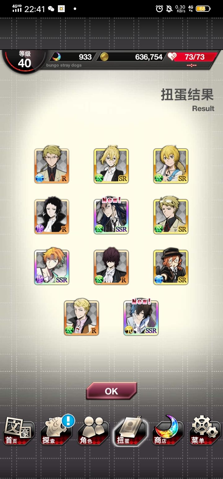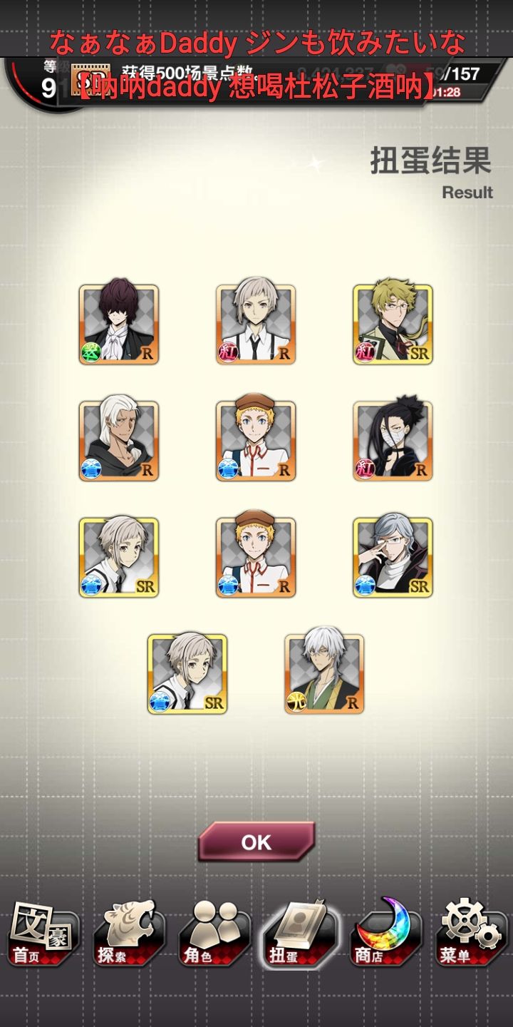 本来看见红月已经点上skip了,结果出了谷崎!然后就想着把刚换完玻璃球拿到的SSR券用了,然后又出了new~爽了