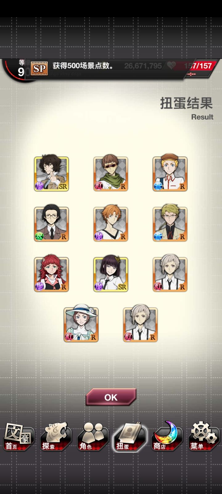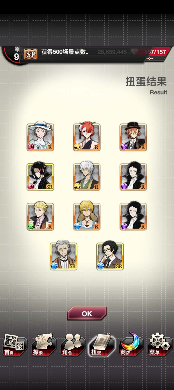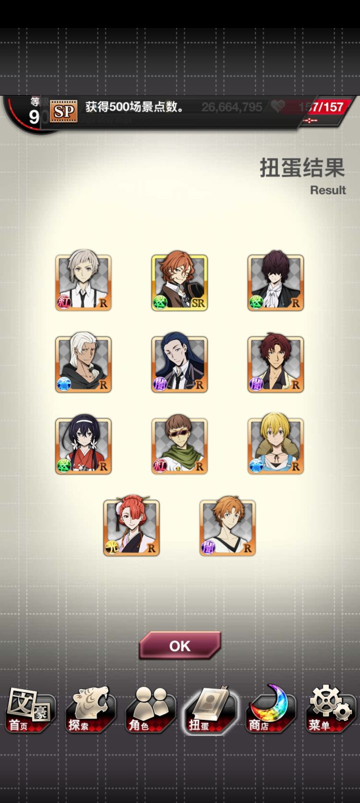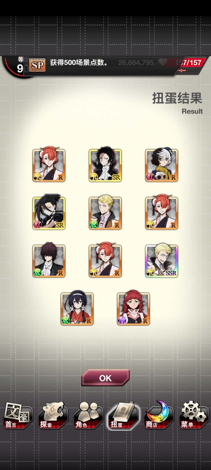 本来看见红月已经点上skip了,结果出了谷崎!然后就想着把刚换完玻璃球拿到的SSR券用了,然后又出了new~爽了