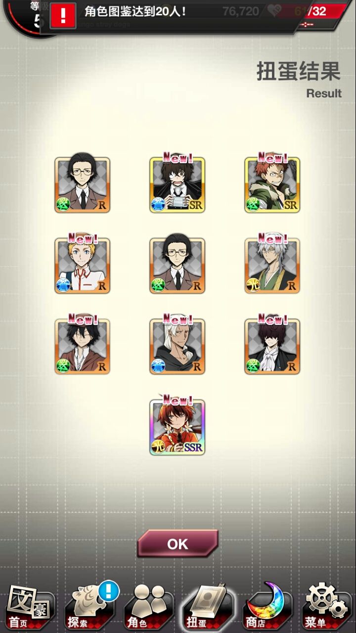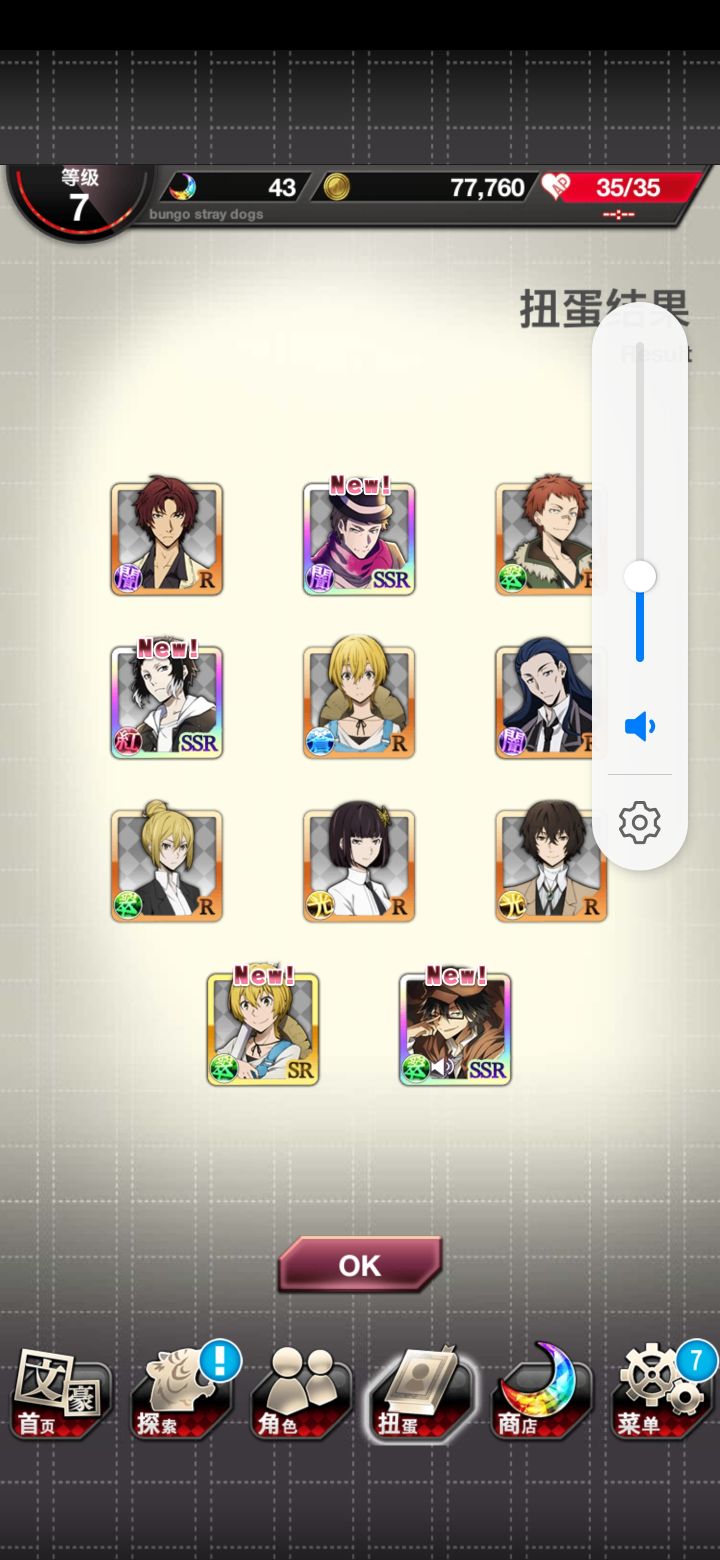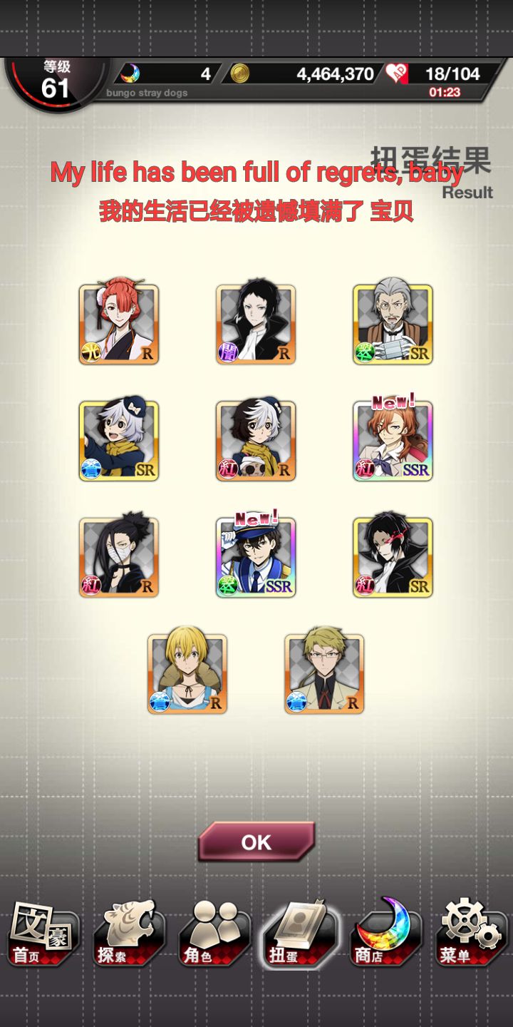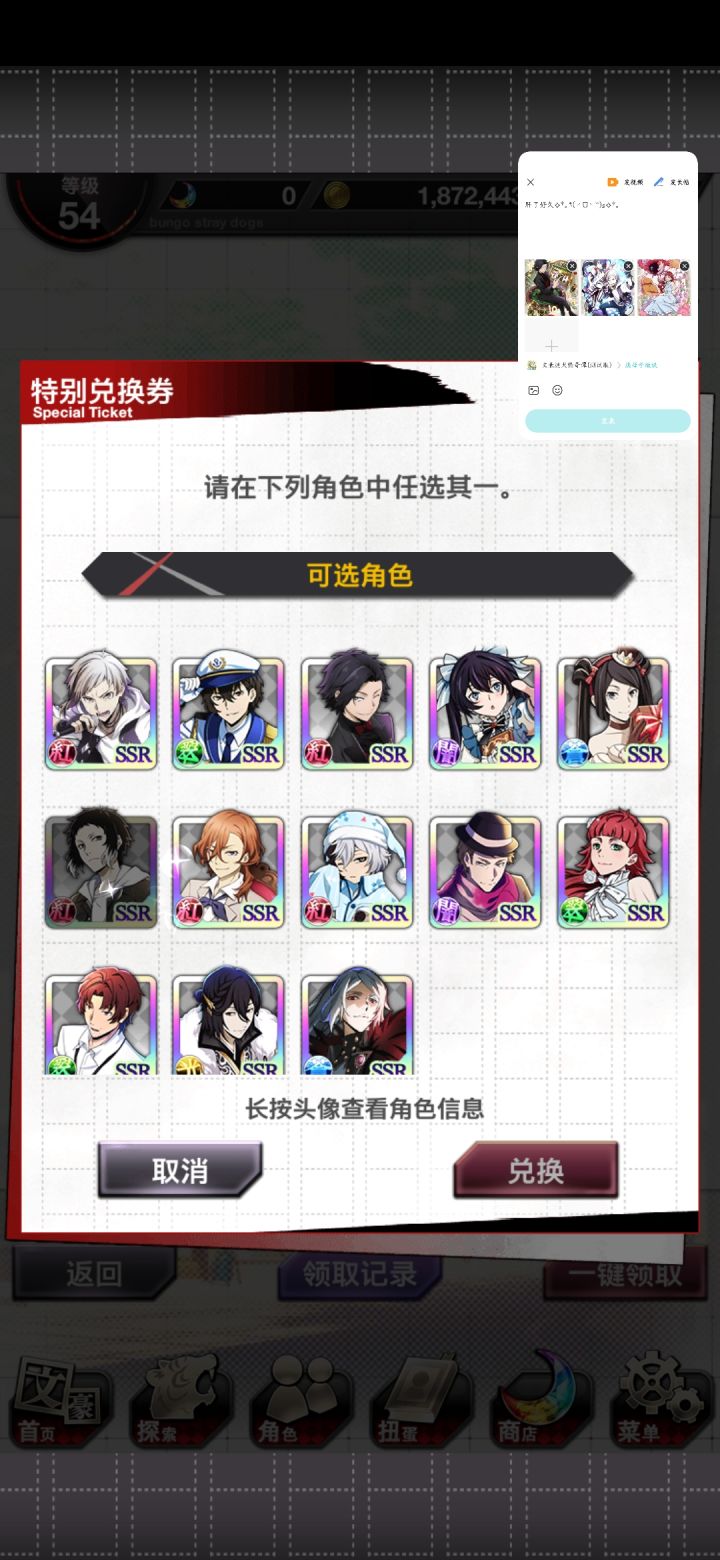 肝了好久✧*。٩(ˊᗜˋ*)و✧*。乱步是红月亮出的(说实话我还以为没有)敦和镜花与安妮是双黄蛋,弱弱的问一句如果要选一个角色选哪个好?