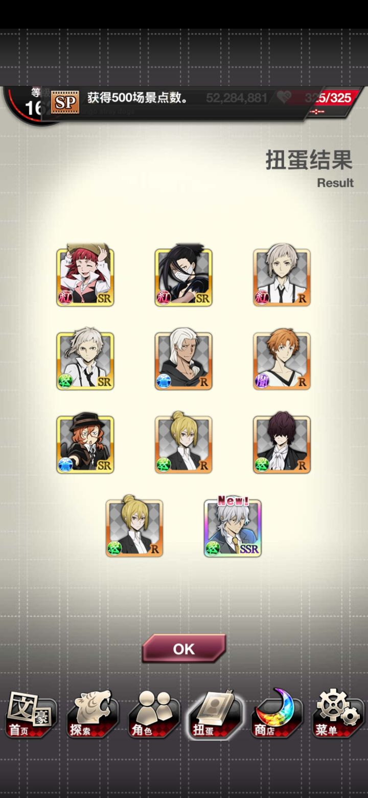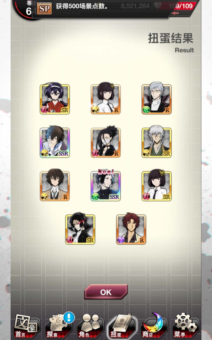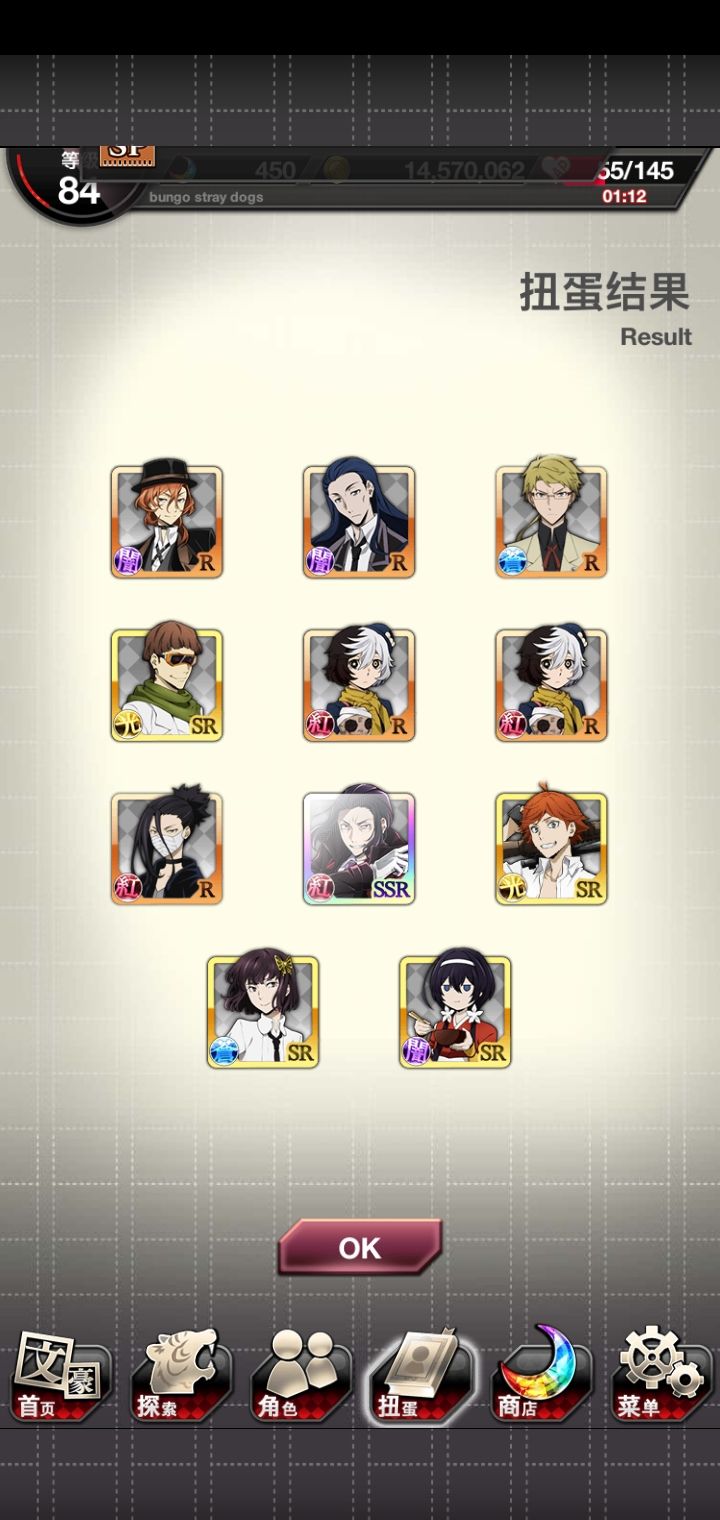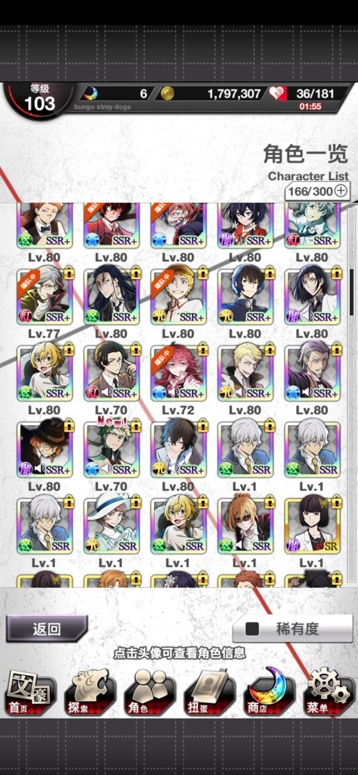 记录又是欧气满满的一天本来之前的活动我抽到过中也和太宰所以这次1/2的概率抽到龙之介和敦,就并不想浪费石头于是用黑漂试了一下一把就抽中了敦,然后又在芥川池试了一下,结果歪到了森先生,但是想了想,两代双黑就差芥川了,于是,我又忍痛拿石头抽了一把,反正就100个打回来也容易,出现的是蓝月,我以为完了凉了,没想到龙之介他还是来了,唉,我这该死的幸运