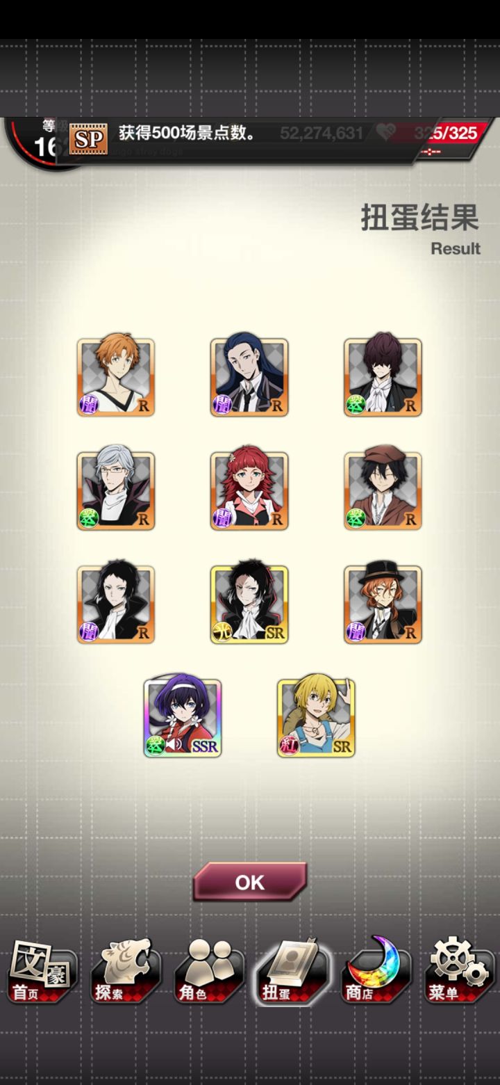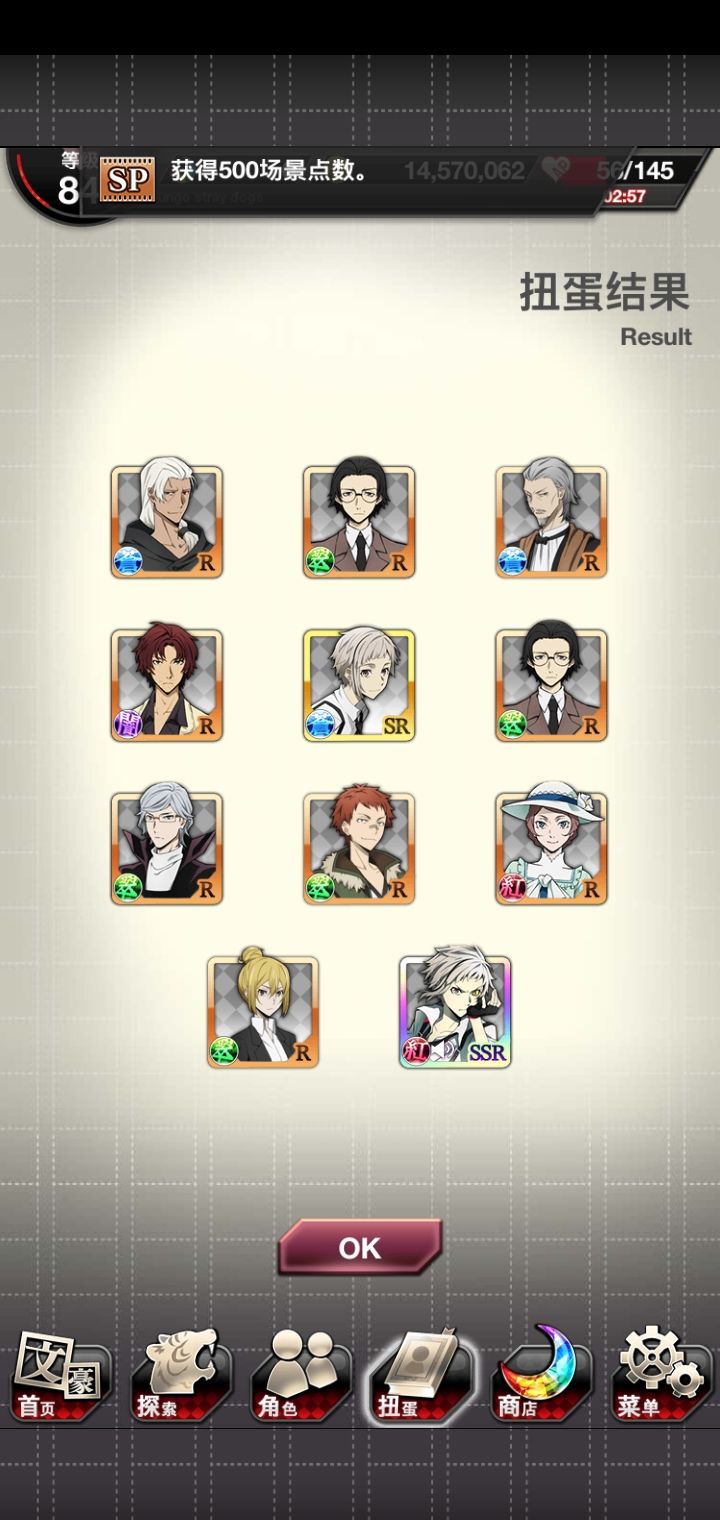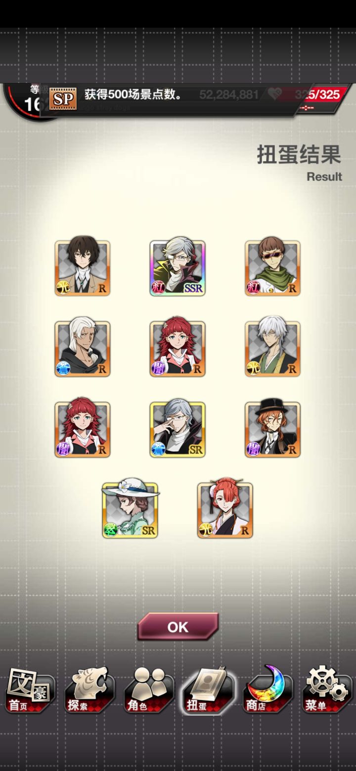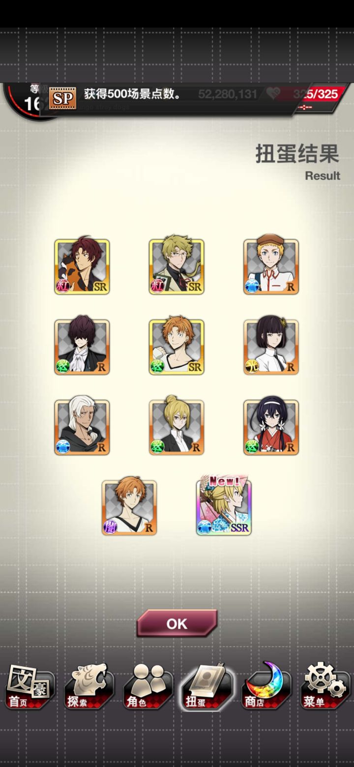 记录又是欧气满满的一天本来之前的活动我抽到过中也和太宰所以这次1/2的概率抽到龙之介和敦,就并不想浪费石头于是用黑漂试了一下一把就抽中了敦,然后又在芥川池试了一下,结果歪到了森先生,但是想了想,两代双黑就差芥川了,于是,我又忍痛拿石头抽了一把,反正就100个打回来也容易,出现的是蓝月,我以为完了凉了,没想到龙之介他还是来了,唉,我这该死的幸运
