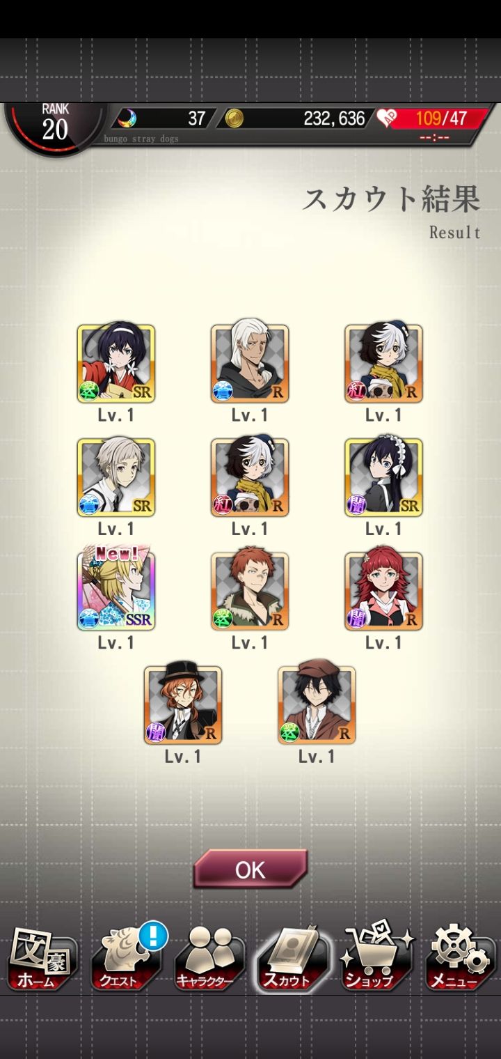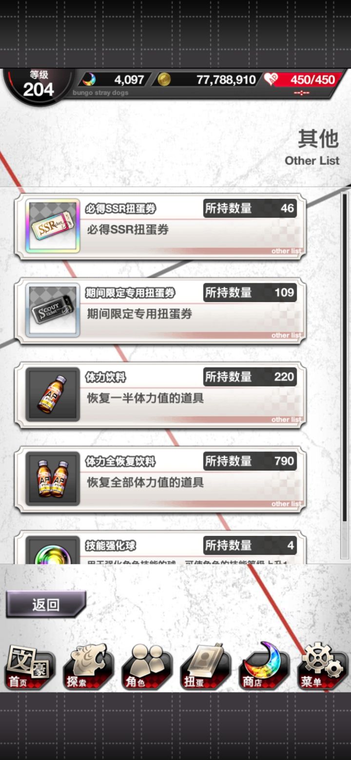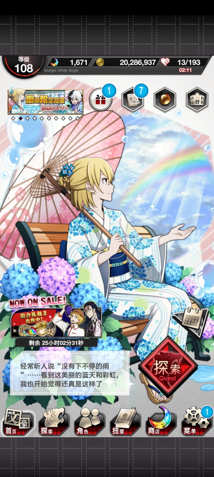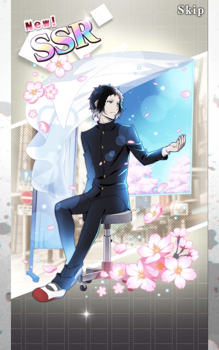 记录又是欧气满满的一天本来之前的活动我抽到过中也和太宰所以这次1/2的概率抽到龙之介和敦,就并不想浪费石头于是用黑漂试了一下一把就抽中了敦,然后又在芥川池试了一下,结果歪到了森先生,但是想了想,两代双黑就差芥川了,于是,我又忍痛拿石头抽了一把,反正就100个打回来也容易,出现的是蓝月,我以为完了凉了,没想到龙之介他还是来了,唉,我这该死的幸运