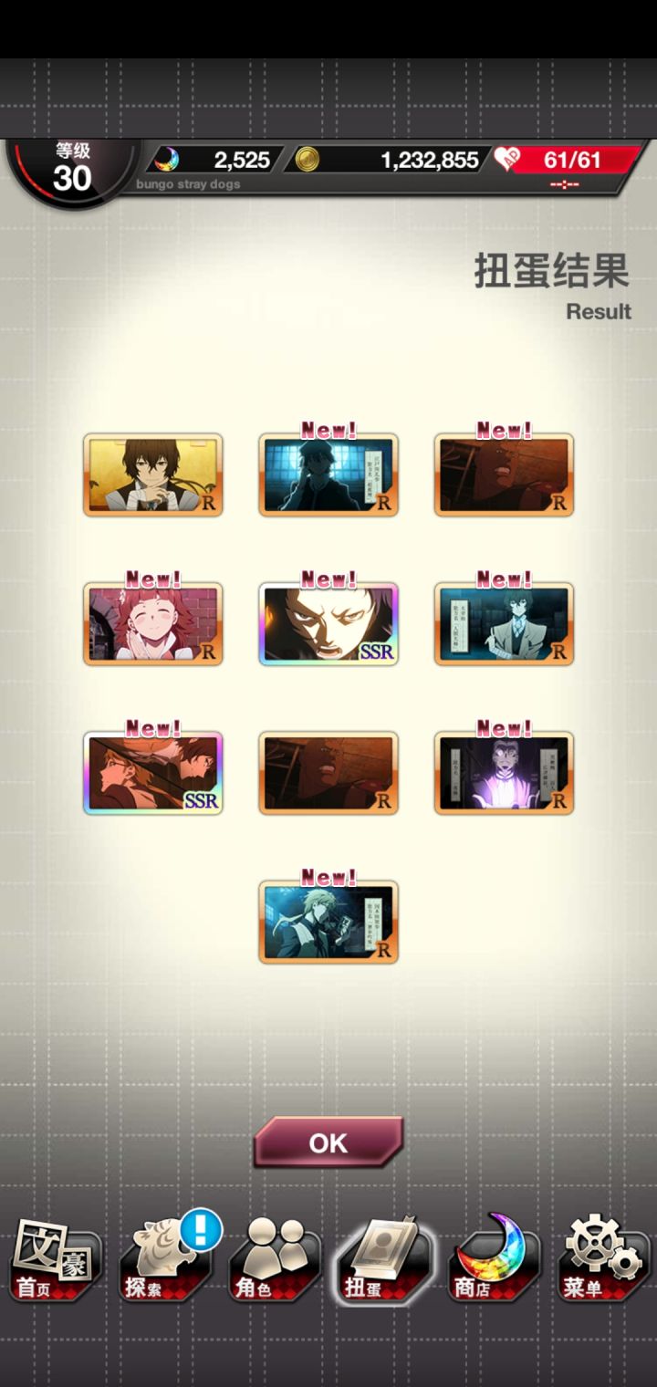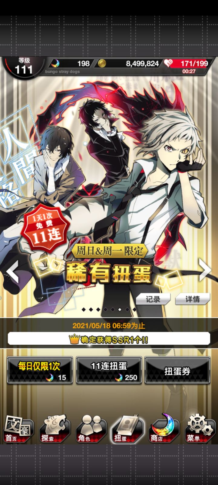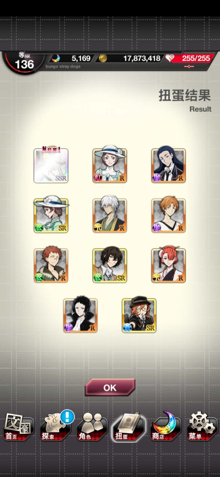 果然太宰会跟着织田作来🤣昨天肝活动的一张必得ssr券+今天和乱步交换玻璃珠的一张ssr券,让我想起之前活动的_(:D)∠)_(平时那当然是重复ssr)