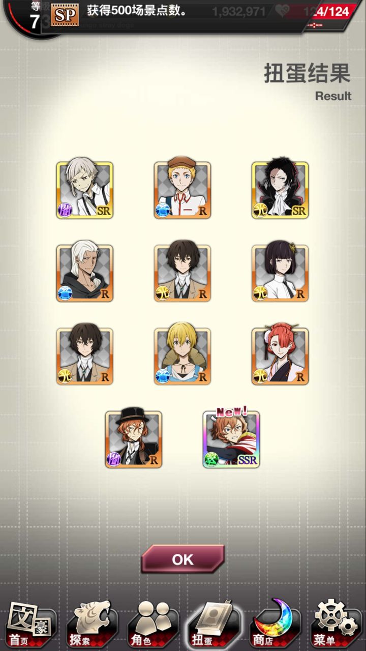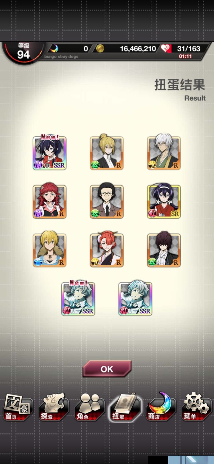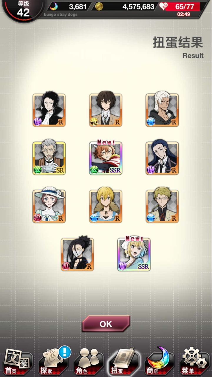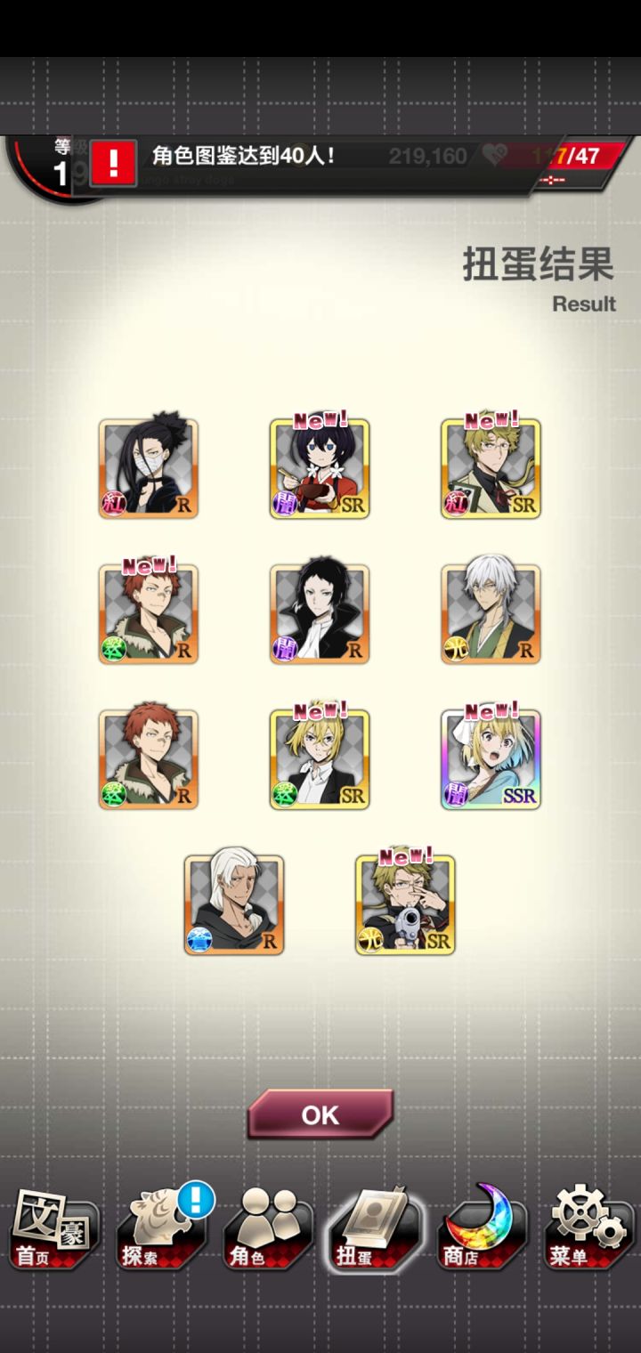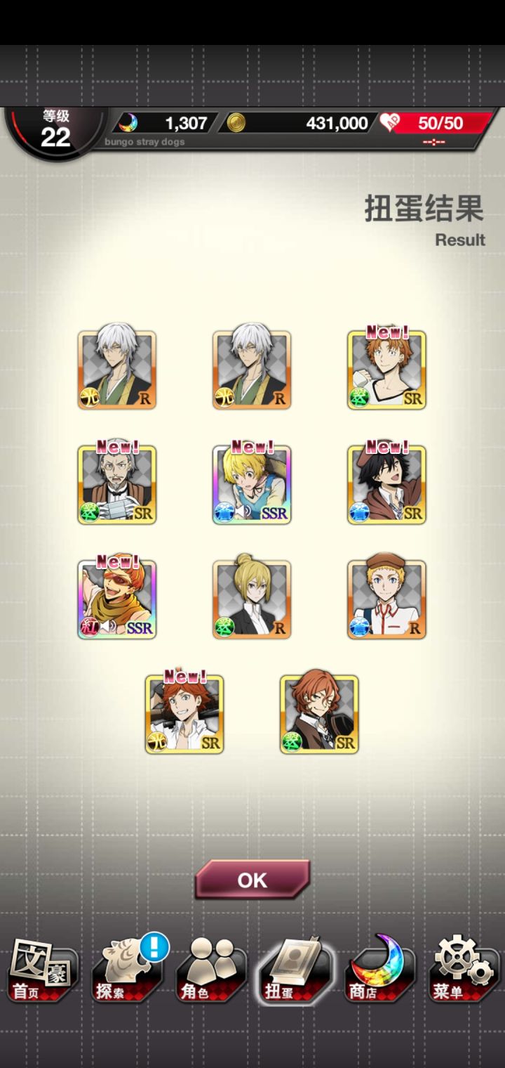 早知道先去正装洗洗脸,第四次了,黑时宰还是没出来 。250干部宰一个,7连普卡安吾,250织田作,之前有人说黑时返场多了。。。是啊,但是我一个黑时宰都没有,活动卡倒是经常没吃保底(唯一的安慰)