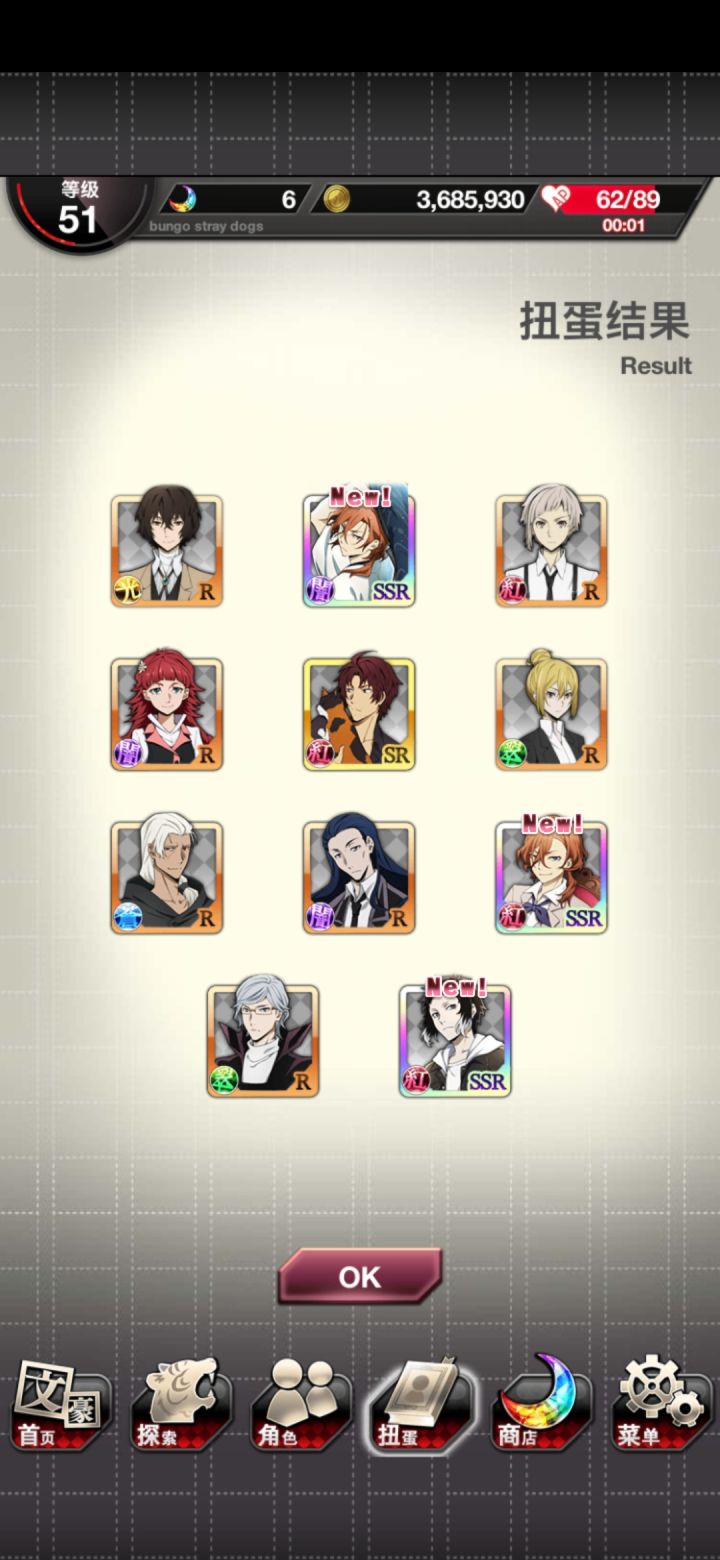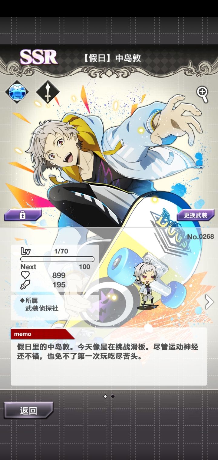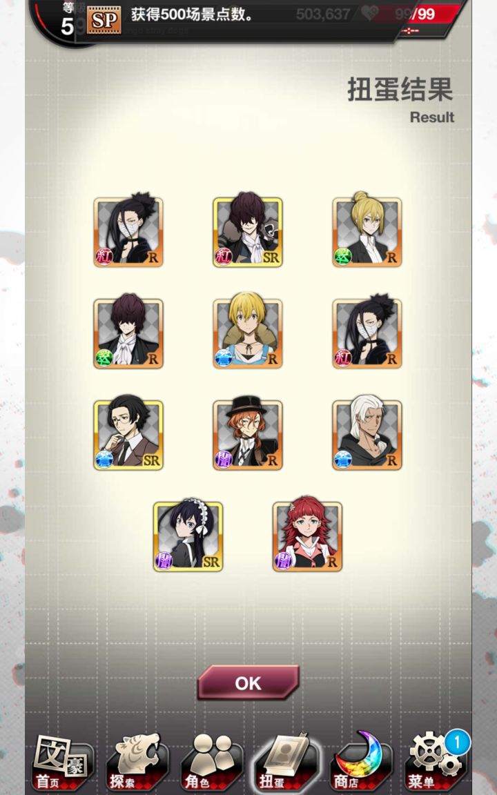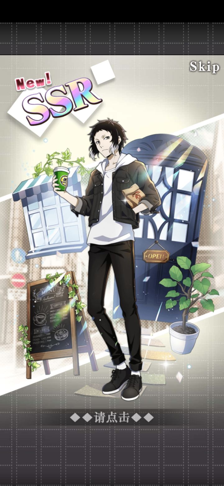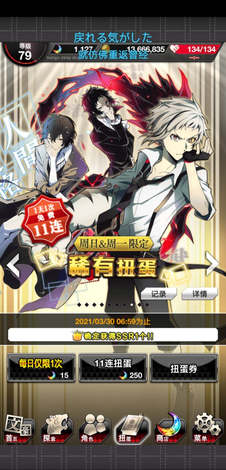 无宰本不想抽,但敦的卡面似乎有点好看就抽了两发(也是为了活动点数哦耶第二次蓝月亮,顺便sr奖券换了没有的人物。但是这个芥川的攻击力不高(ノ_・。)