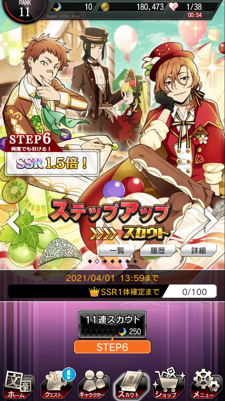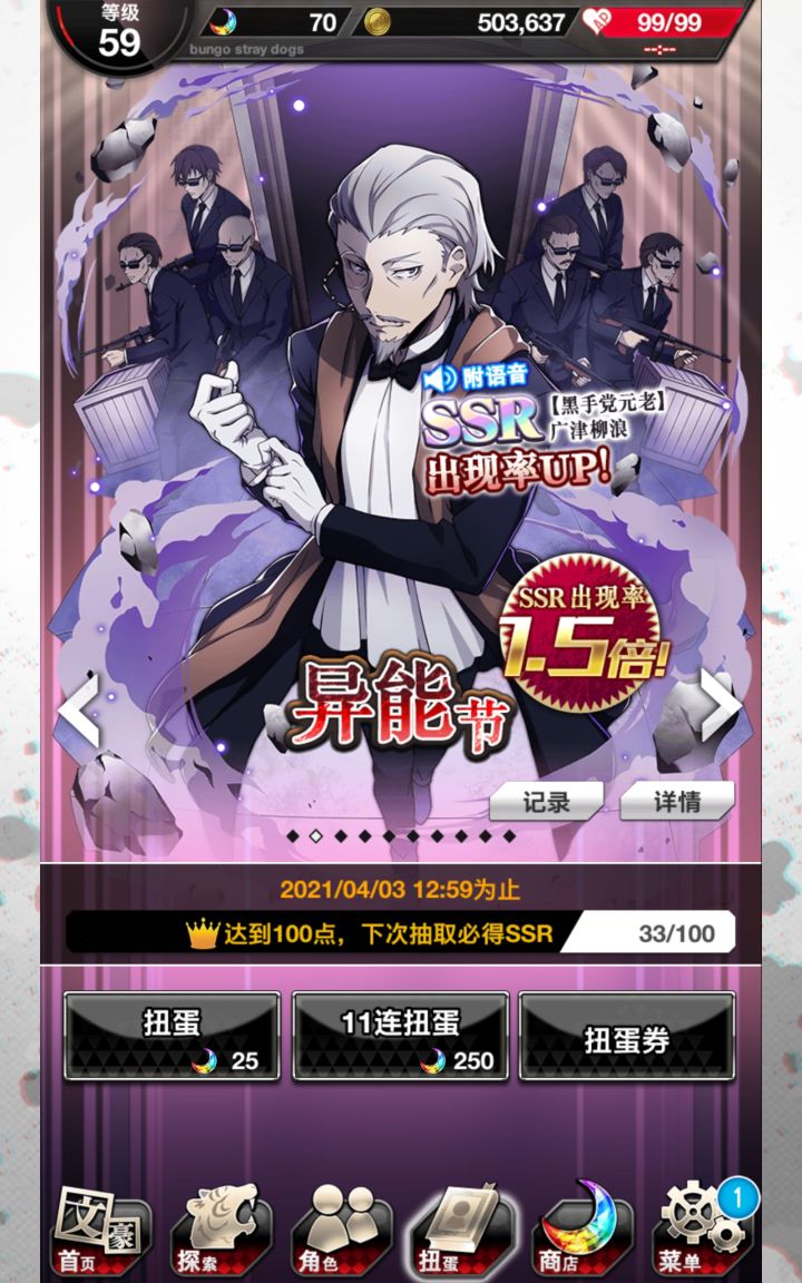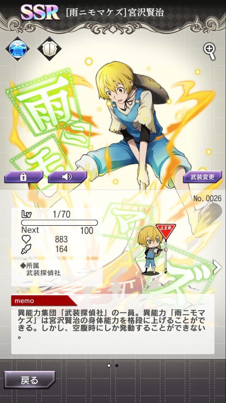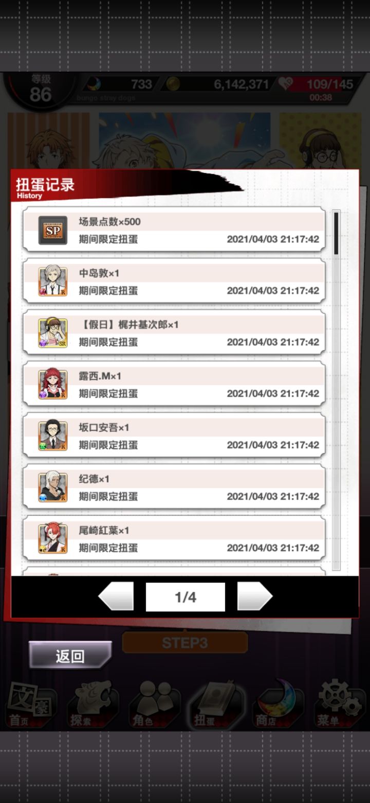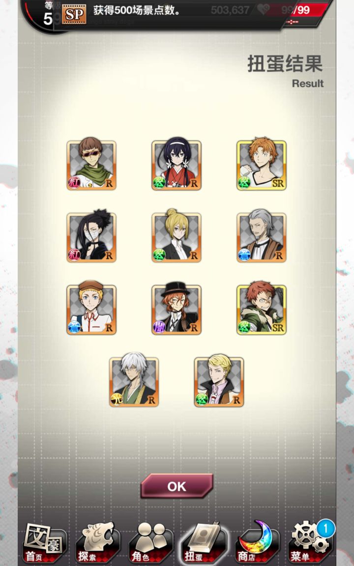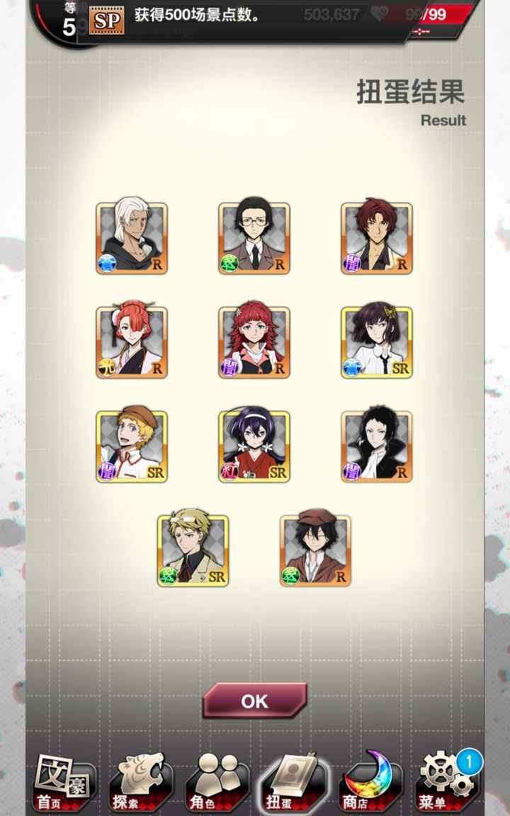 无宰本不想抽,但敦的卡面似乎有点好看就抽了两发(也是为了活动点数哦耶第二次蓝月亮,顺便sr奖券换了没有的人物。但是这个芥川的攻击力不高(ノ_・。)
