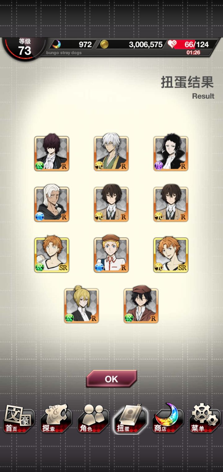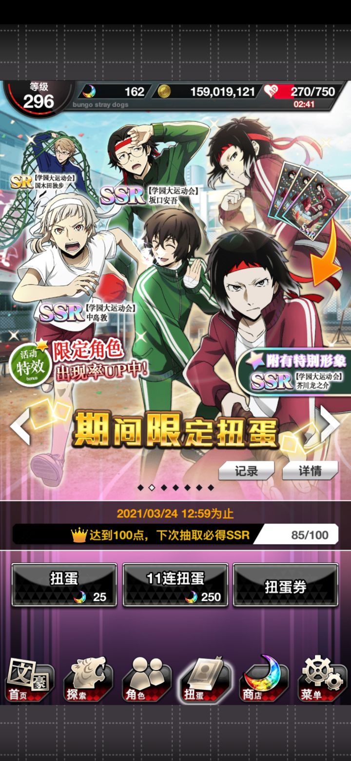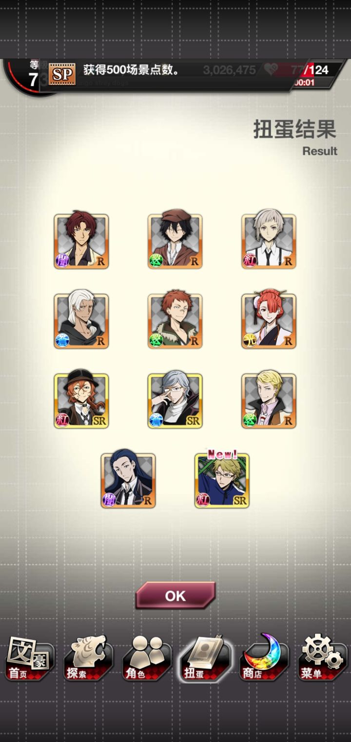 运动会太宰先生我可以!由于,活动点数还没开始,所以为了背景中的太宰先生疯狂抽芥,还好,大号给力到s3两个芥芥,虽然两个小号啥都没出但是我依旧嗨皮,立刻开特效卡面,太宰先生我可(就算只有背景)。接下来就是强肝了。大号还有900多石头,嗯运动会活动还没打,留着下一个宰,砸!