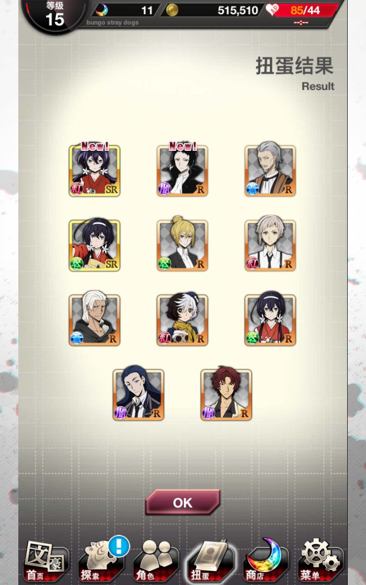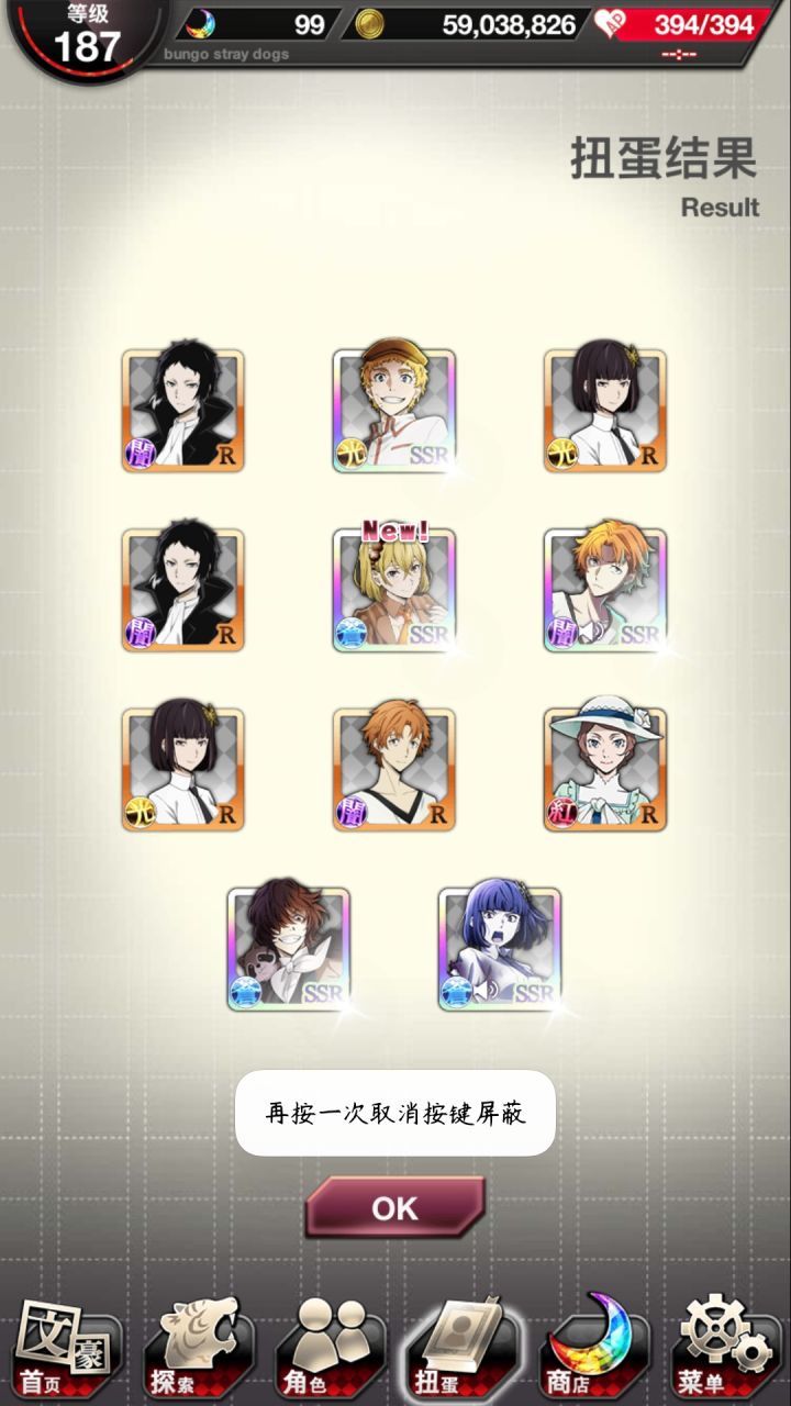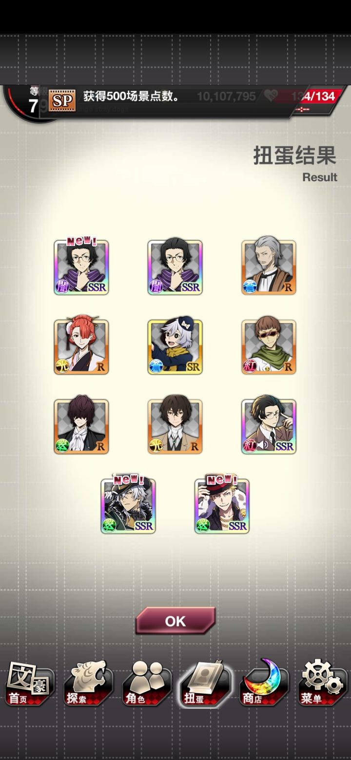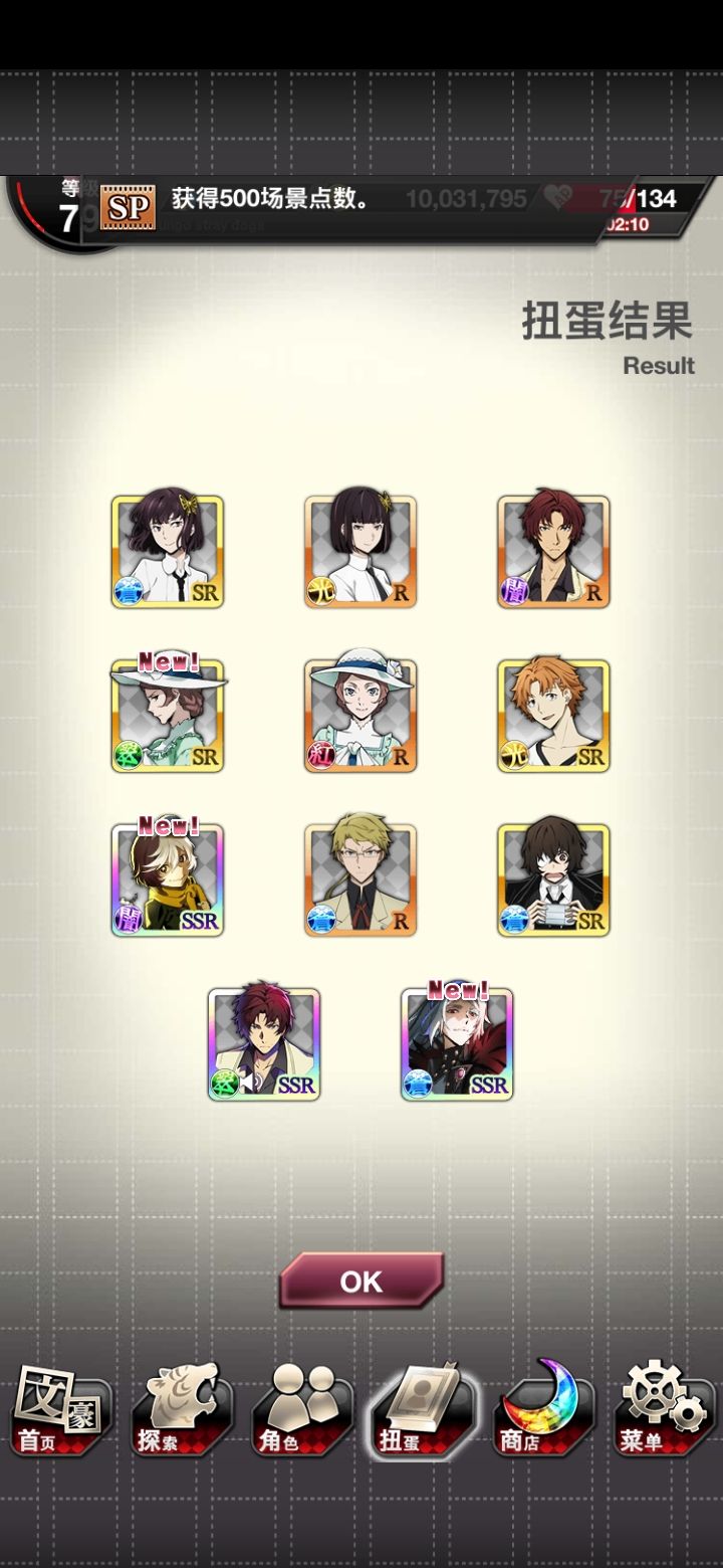 没错还是我,今天登上游戏就突然有一种预感,由于上次没抽中,而我还有两个小号,然后我就肝齐了石头再次尝试。然而没错,第一个小号还是没中。接着我去了第二个小号,欧了,双黄毕业,一次全中,芥芥出来的时候吓死我了,但是太宰先生还是爱我的,我可以!继续肝石头坐等周年庆!