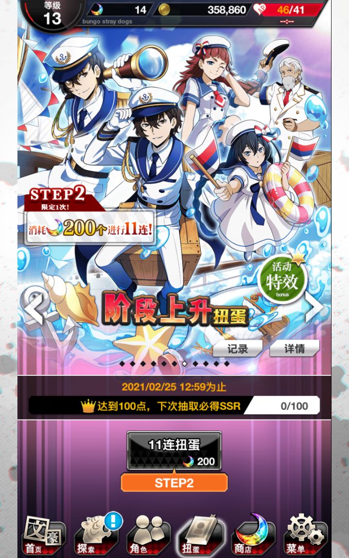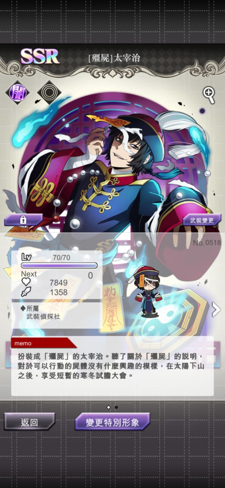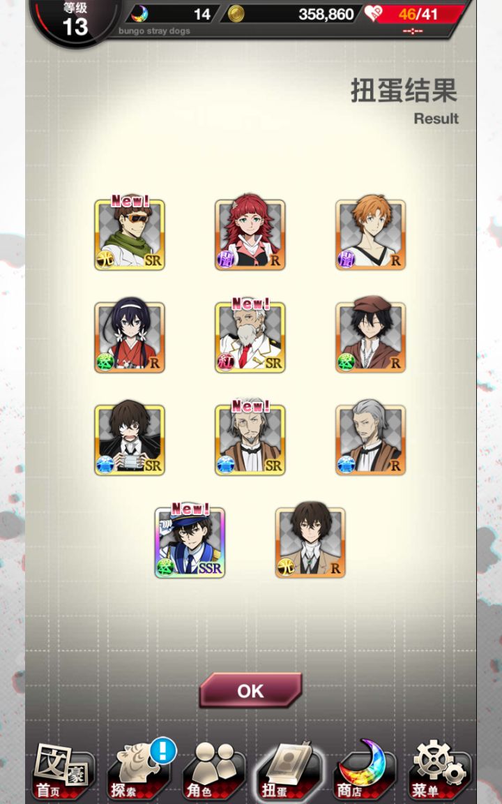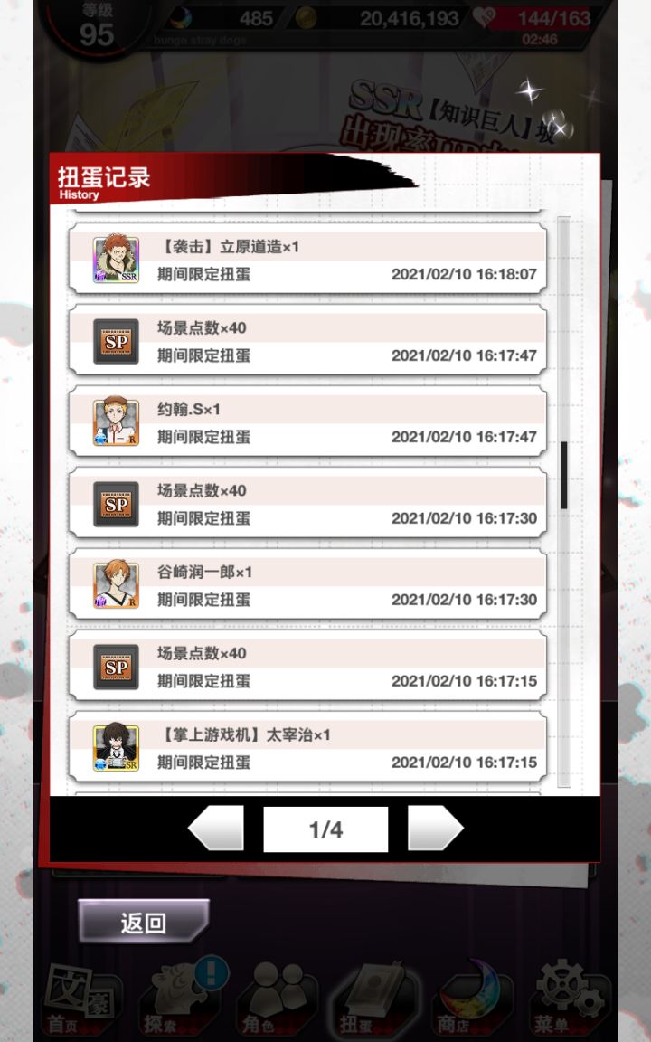 没错还是我,今天登上游戏就突然有一种预感,由于上次没抽中,而我还有两个小号,然后我就肝齐了石头再次尝试。然而没错,第一个小号还是没中。接着我去了第二个小号,欧了,双黄毕业,一次全中,芥芥出来的时候吓死我了,但是太宰先生还是爱我的,我可以!继续肝石头坐等周年庆!