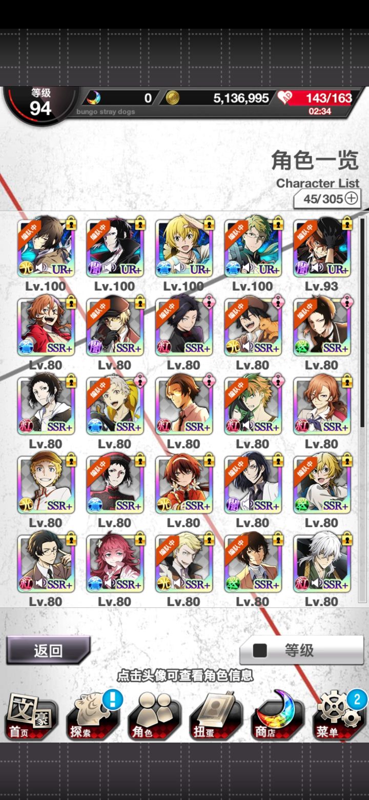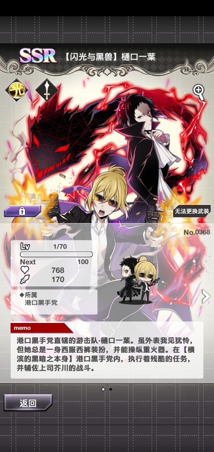 活动一1.中华街第三弹(阶段上升扭蛋+掉落副本复刻)新卡池 国服首发角色 ssr涩泽龙彦ssr陀思妥耶夫斯基sr太宰治复刻副本掉落 sr森鸥外2.限时兑换活动(也就是1314)可获得ssr【闪光与黑兽】樋口一叶3.新武装(新皮肤)乱步和镜花(两个)4.复刻卡池 贺正(阶段保底)新春(阶段保底)5.周年福利30天登录即可全部领取,活动为36天,有6天可以补签6.老三样活