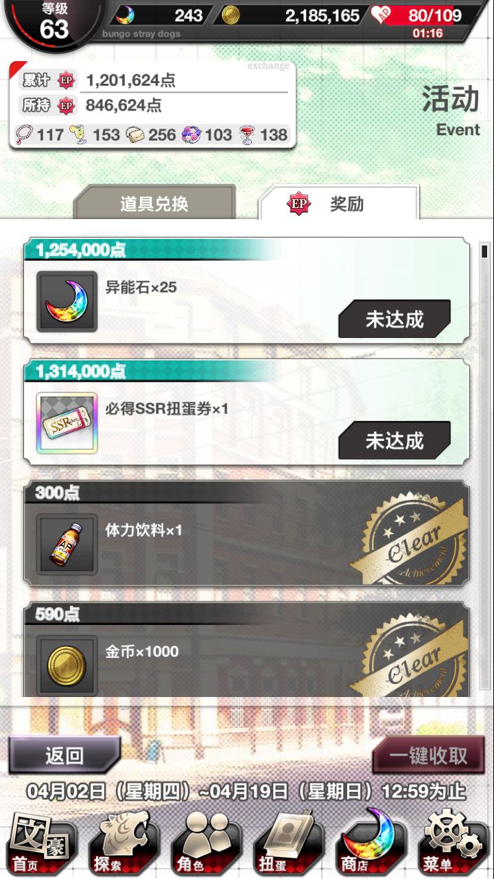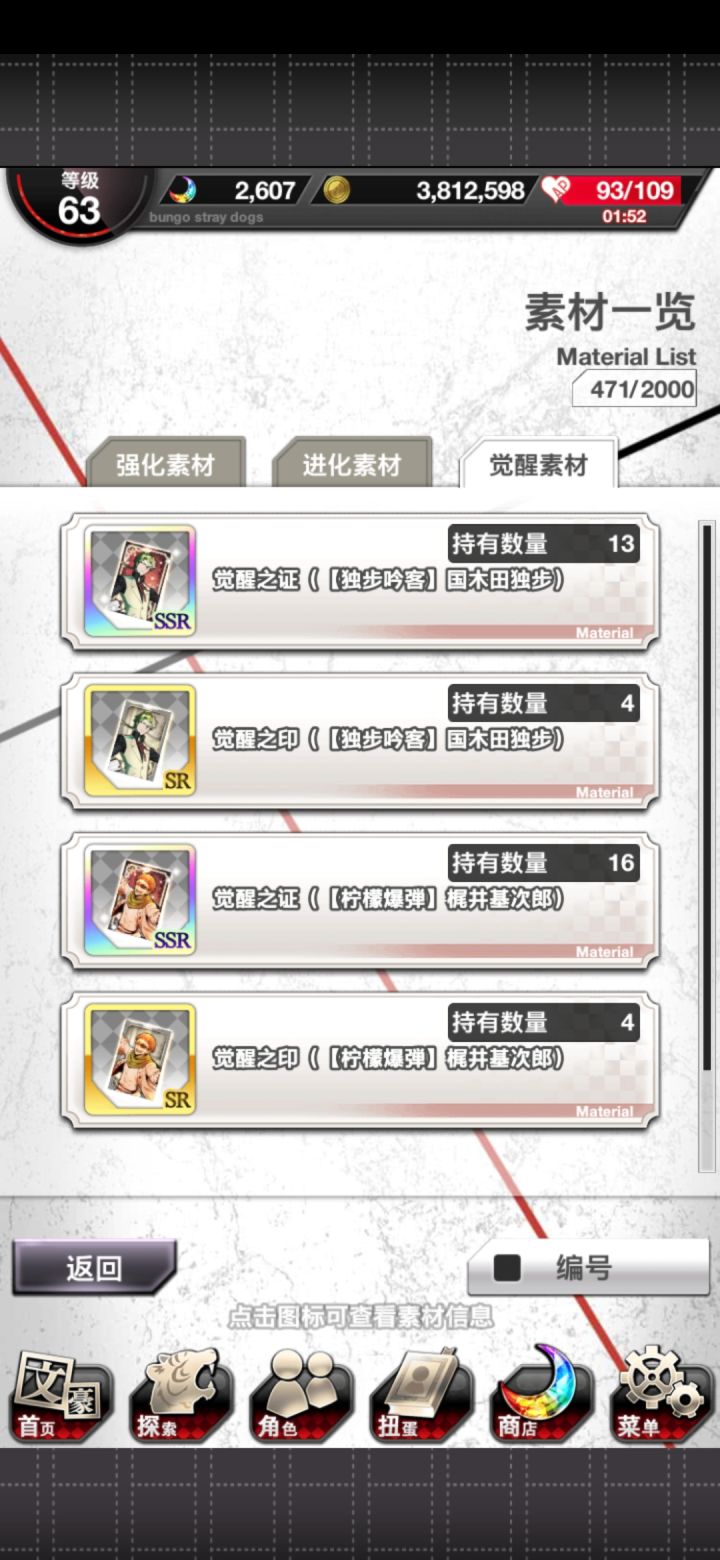 为了国木田,我浪费了好几管全体力瓶和十几个石头终于把他觉醒了,不过UR的进化材料好麻烦啊