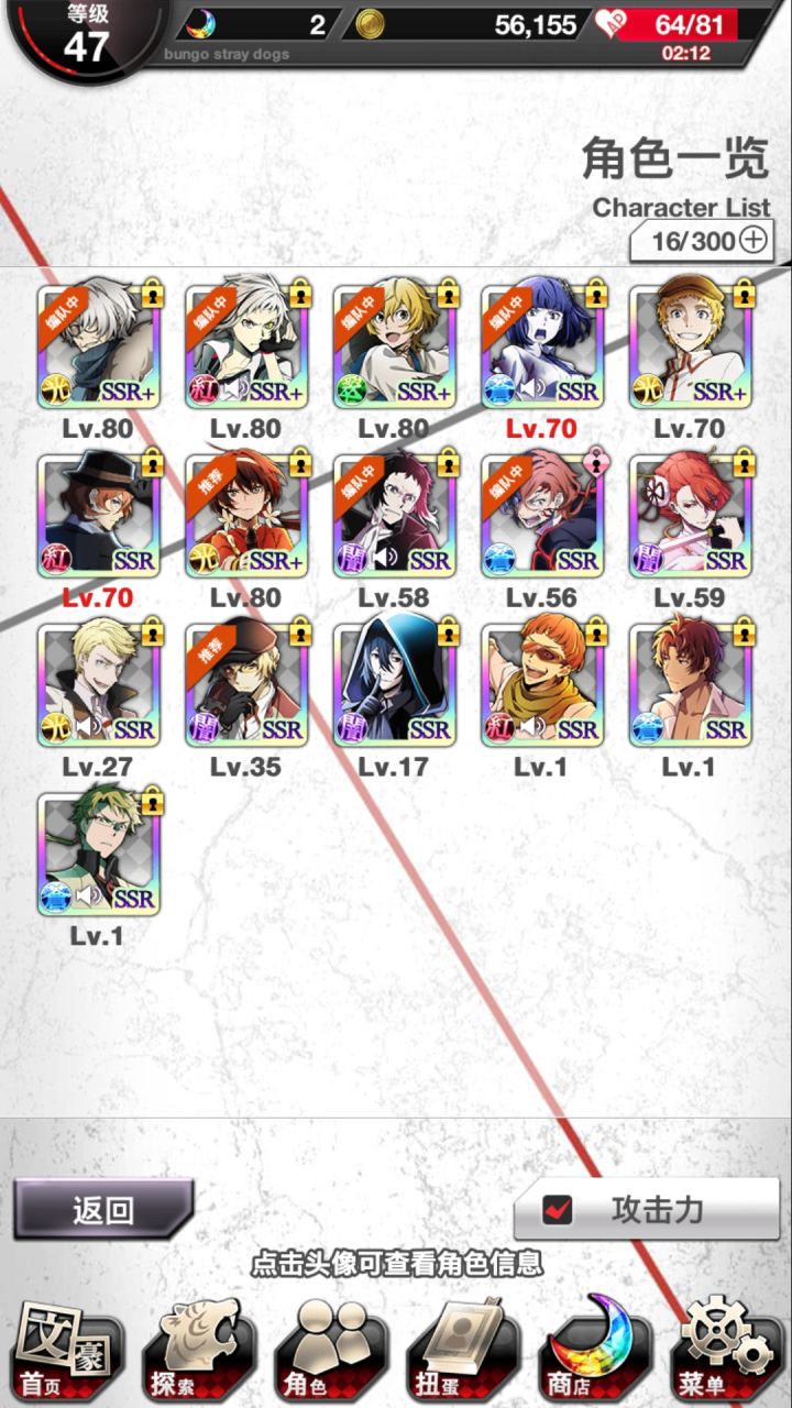 其实这游戏我玩了有半年了,直到前天才有20级。后来,我发现打Very hard级别的素材关很容易升级,于是就猛升了20几级。然后现在有的几个SSR+都是这几天才肝出来的。说实话,我觉得我这半年没发现这个真的很亏啊!京极夏彦池子刚出来时我一发抽到后就开始攒石头了,今天刚刚出了葡萄和国木田妈妈,以及S3给的织田作。我觉得,我真的不欧,甚至是几次全R,但玩这个游戏总感觉很轻松(啊我不怎么肝活动),石