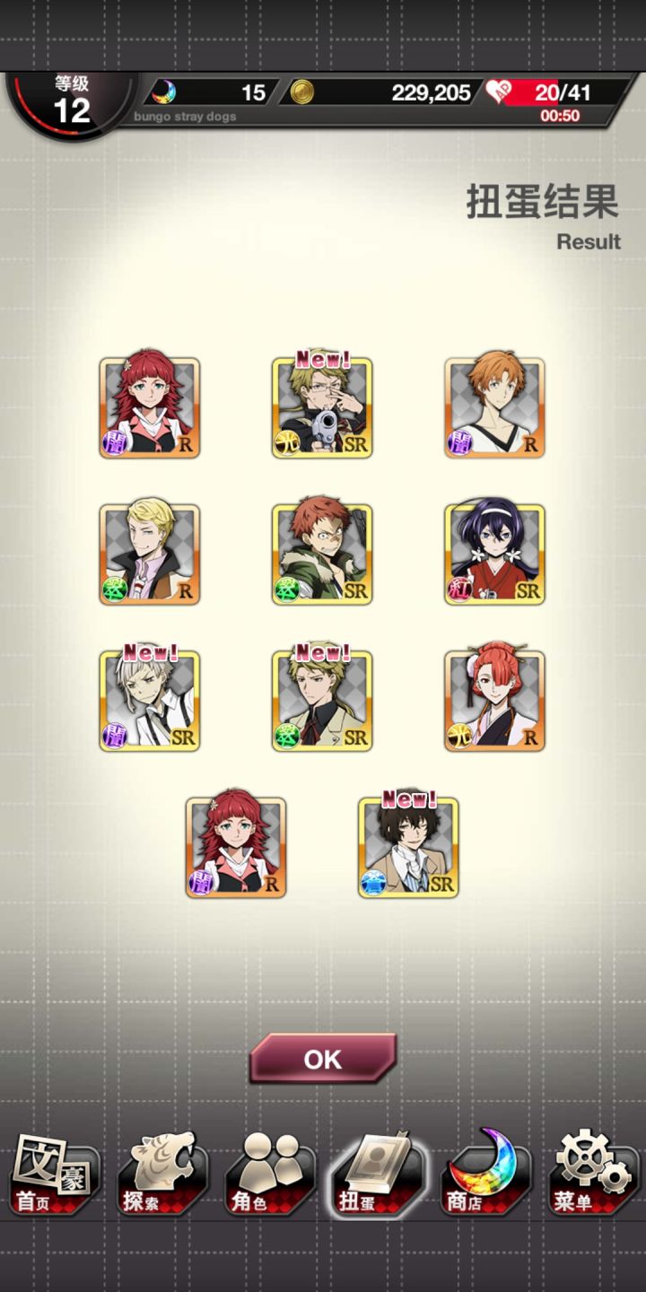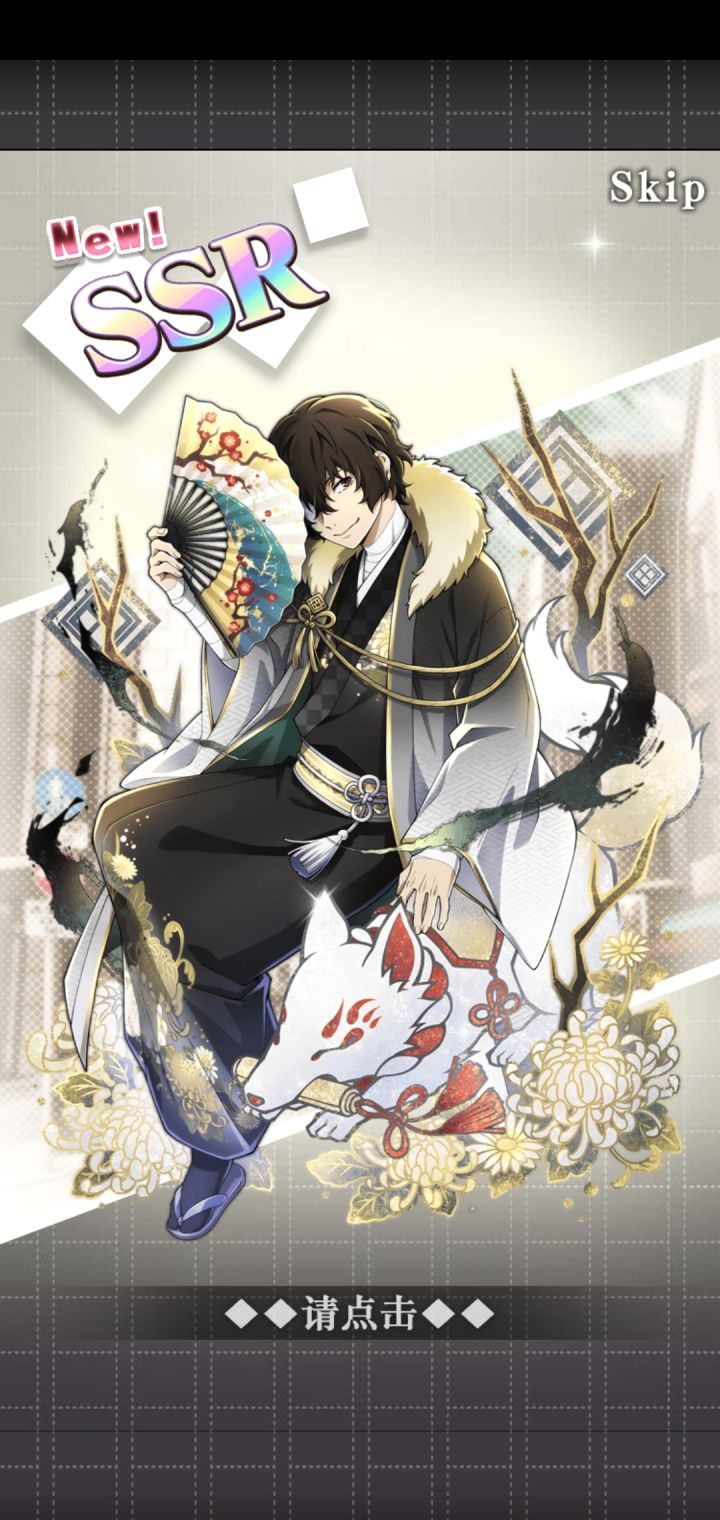 游戏下载一共7小时只抽新春纪念卡池肝到阶段9终于把这次的限定SSR都肝到还把哒宰进化到ssr+织田作和涩泽都抽到过两次,满级了,但材料没肝,没法进化,中也刚抽到不久,陀总刚刚抽到,支持我肝到阶段9的动力就是这次新春服装的陀总美颜!!!!下图是抽到SSR的顺序↓
