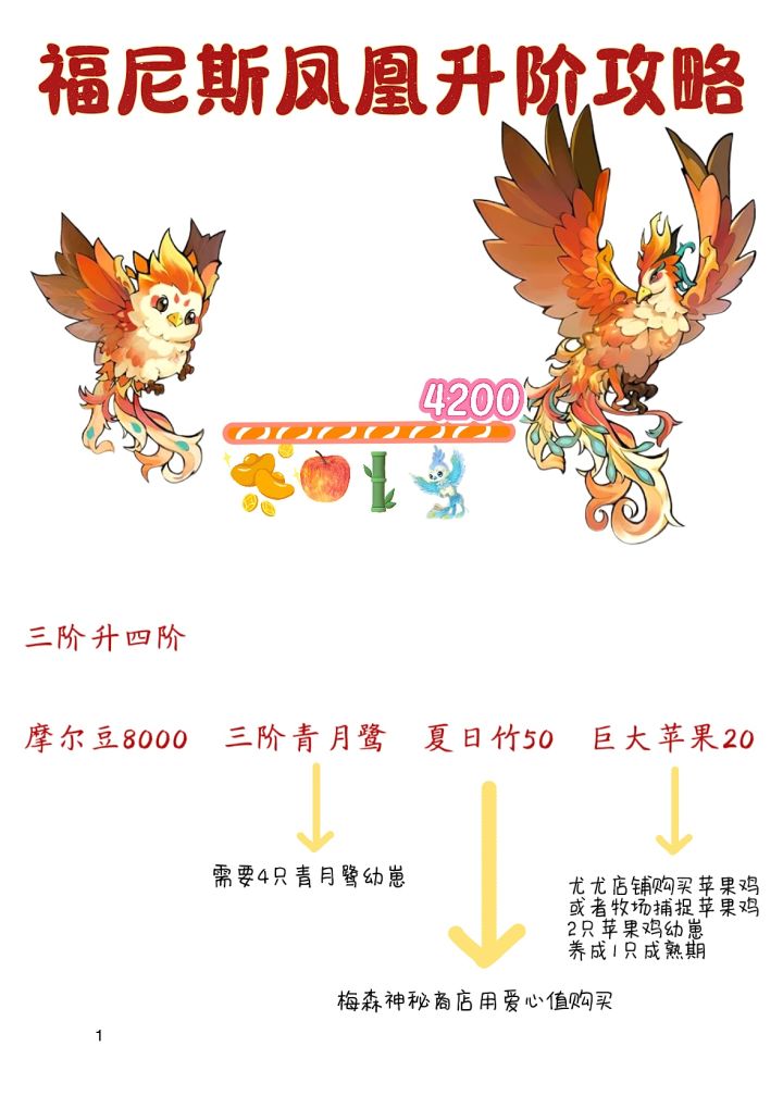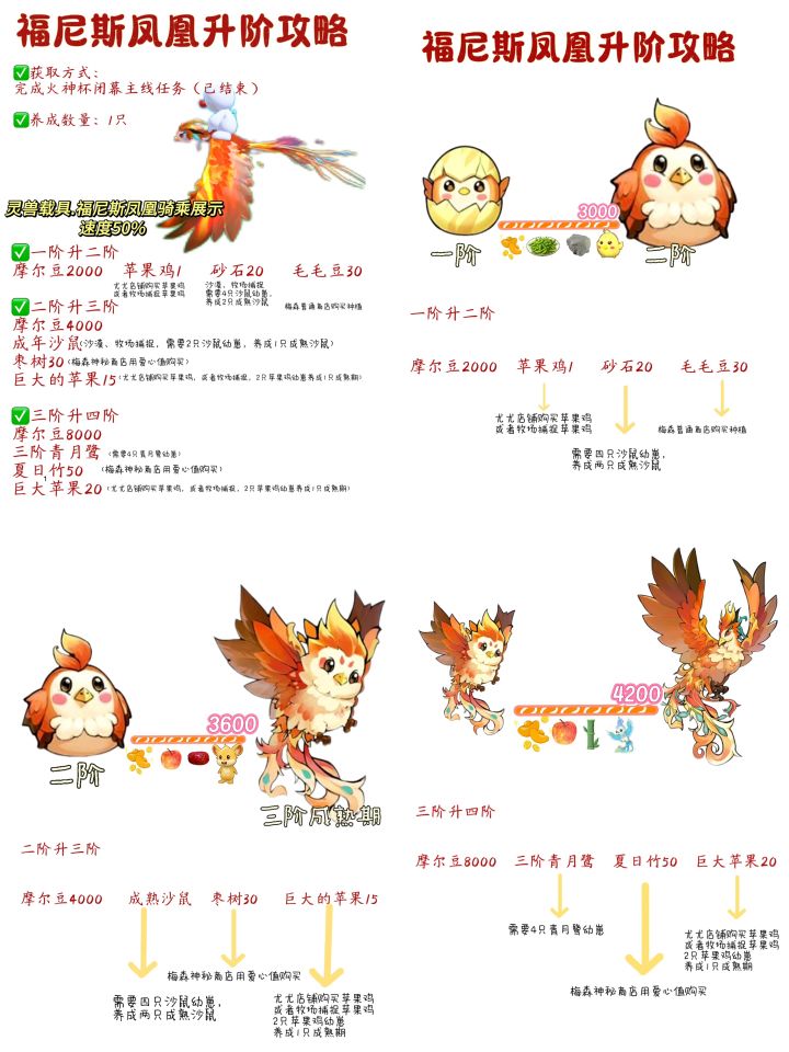 【福尼斯凤凰】获取方式:完成火神山闭幕主线任务(已下架)养成数量:1只——————————————————————————✅一阶升二阶摩尔豆2000苹果鸡幼崽✖️1毛毛豆✖️30 砂石✖️20(需要四只沙鼠幼崽,养成两只成熟沙鼠) ✅二阶升三阶摩尔豆4000成熟沙鼠✖️1枣树✖️30(梅森神秘店铺购买)巨大苹果✖️15(养苹果鸡获得) ✅三阶升四阶摩尔豆8000