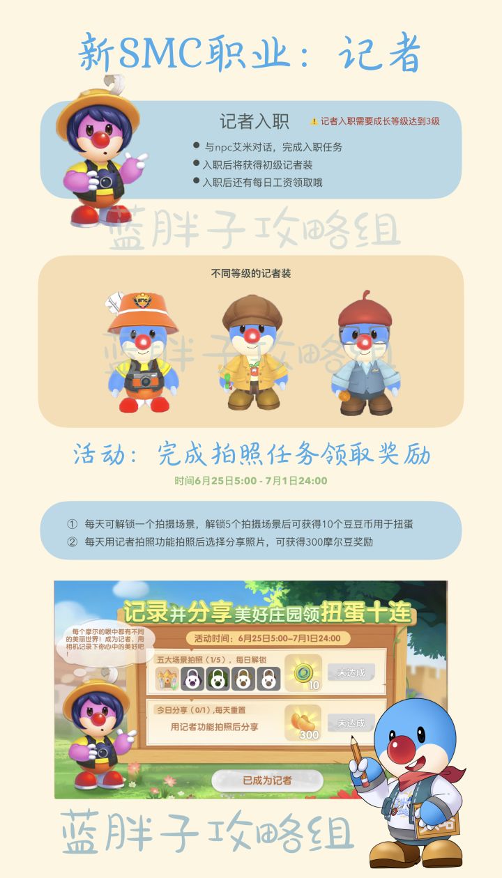 活动一:新增SMC职业记者小摩尔们入职【记者】后可以使用滤镜、贴纸、动作,随着等级提升可以解锁更多内容,还有每日工资可以领取哦。活动二:庄园巡游记时间: 6月25日5:00—7月1日24:00活动内容:伴随新职业记者的到来,NPC艾米向摩尔们发布了新活动!赶快拿着相机前往摩尔庄园中的经典场景打卡吧,记录你在庄园的美好瞬间!活动三:摩尔宅急送活动开启时间: 6月28日5:00—7月8日2
