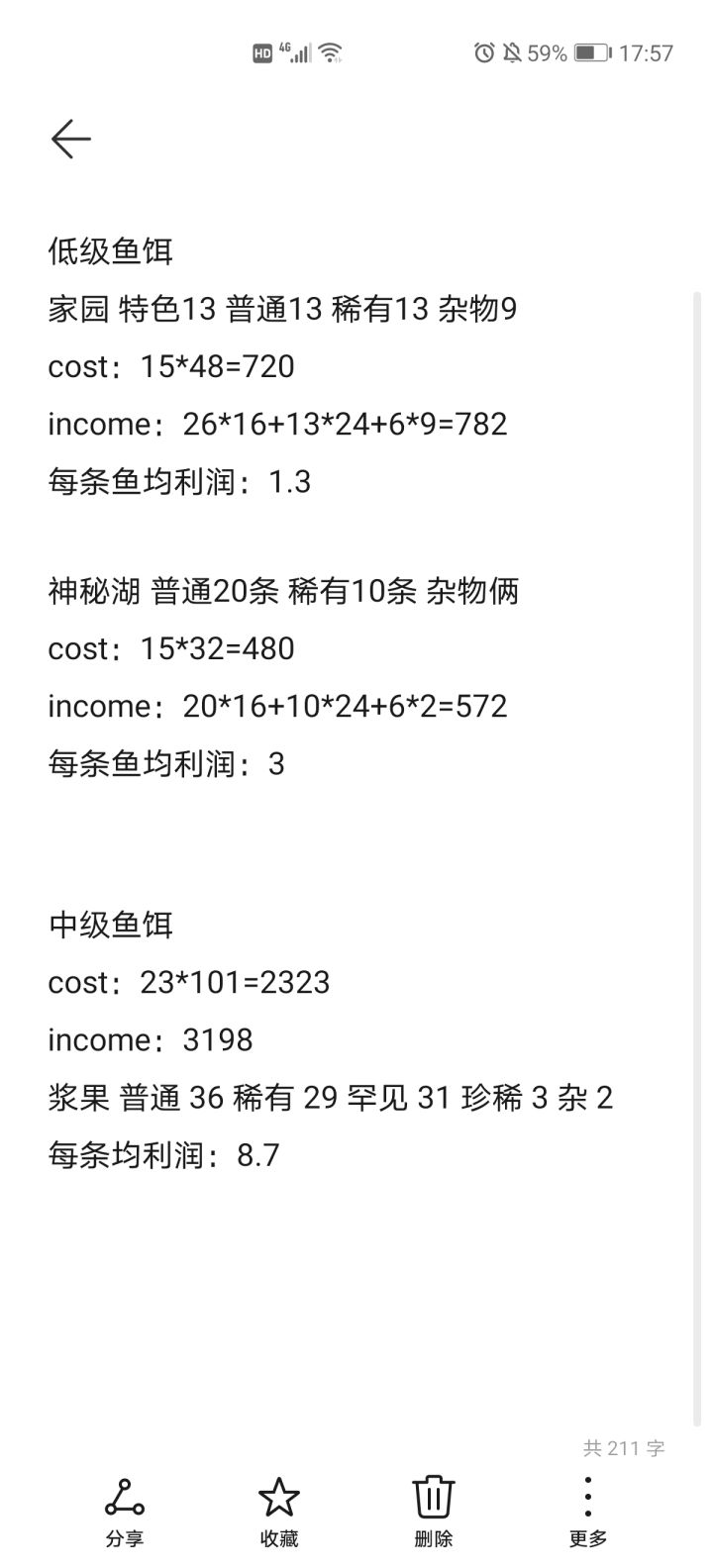 做了一点点钓鱼利润的统计普通饵基本上没必要钓 家园那个特色是另外一回事 为了食材还是可以搞得 确实做菜可能利润不少但自己其他的材料有限还是餐厅挂着做浆果烧饼吧有推荐的赚钱方式请联系我谢谢