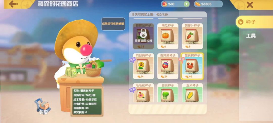 蟹黄树种子帮忙解决下呗,今天刚刚入坑,感觉种子和货币完全不够呀😥期待解决呀呀呀呀呀@摩尔庄园