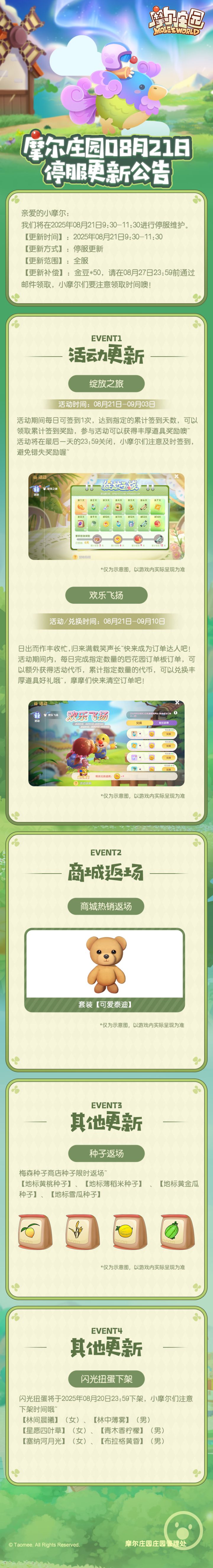 亲爱的小摩尔: 我们将在2025年8月21日9:30-11:30进行停服维护。 【更新时间】:2025年8月21日9:30-11:30【更新方式】:停服更新【更新范围】:全服 【更新补偿】:金豆*50,请在8月27日23:59前通过邮件领取,小摩尔们要注意领取时间噢!#摩尔庄园