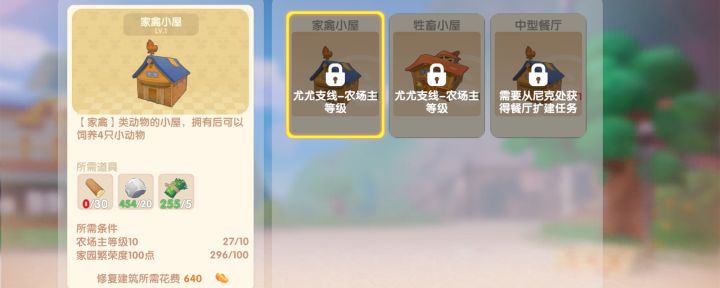摩尔庄园中,当农场主等级达到14级就可以在尤尤处接取支线,完成支线任务后就可以解锁禽舍,再找汤米委托修复篱舍,等待一天之后就可以修复完成了,之后还会解锁牲畜小屋。在家禽小屋中,可以通过尤尤购买鸡鸭进行养殖,鸡鸭可以产出鸡蛋鸭蛋,鸡蛋鸭蛋可以用来进行订单交付或作为烹饪的原材料。在牲畜小屋中可以养牛和羊,牛可以产出牛奶,羊可以产出羊毛。当完成支线后优先解锁的是家禽小屋,随着后续支线任务的完成,可以解