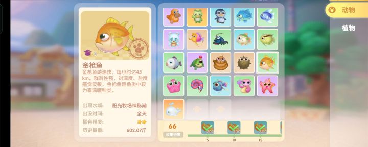 摩尔庄园中,金枪鱼需要在阳光牧场的神秘湖中进行垂钓,没有固定的出没时间,全天都可以进行垂钓,金枪鱼的稀有度不算高,所以上钩率不低,只要耐心就可以很快钓到。摩尔庄园中,有很多垂钓点,靠近垂钓点后,点击右下角的鱼竿可以进入垂钓状态,垂钓时可以选择使用什么鱼饵,使用的鱼竿和鱼饵越高级,能钓上来高级鱼类的可能性就越高,购买渔网捕鱼的成功率更高但同时成本也较高。收集解锁生物图鉴可以获得智慧值,每种生物的智