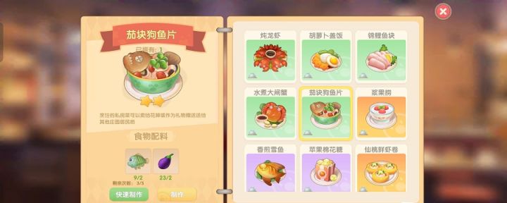 狗鱼可以制作成茄块狗鱼片。制作方法:狗鱼×2+茄子×2。火候:中火。料理品级:2星。制作等级要求:需要厨师等级达到5级或以上才能制作。狗鱼:狗鱼作为游戏中的家园特产,需要从家园中的鱼塘中钓鱼获得,需要家园拥有狗鱼特产,如果没有,需要从拥有该特产的好友家园鱼塘钓鱼获得,全天都可以刷新狗鱼,获取难度小。茄子:茄子是家园农作物,可通过种植的方式直接获得,茄子种子在梅森种子商店购买,使用茄子种子种植,