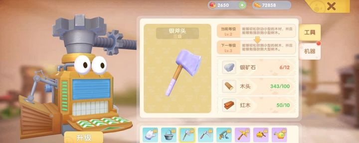 斧子获得方法家园空地上会随机刷新出一些东西(杂草、树木、石头),小摩尔们可以用工具清理这些东西,同时也能获得对应的材料(草、麻、木头、红木、石头、矿石),然后使用特定的工具进行生产便可以获得斧子。斧子的升级方法:第一种是主动对斧子进行升级,这个升级的方法需要收集升级斧头的原材料才能完成。斧子的升级需要铜矿石和木头,这些材料无论是在梅森的商店里,还是自己的庄园里都是可以获得的。不同等级消耗的材料数