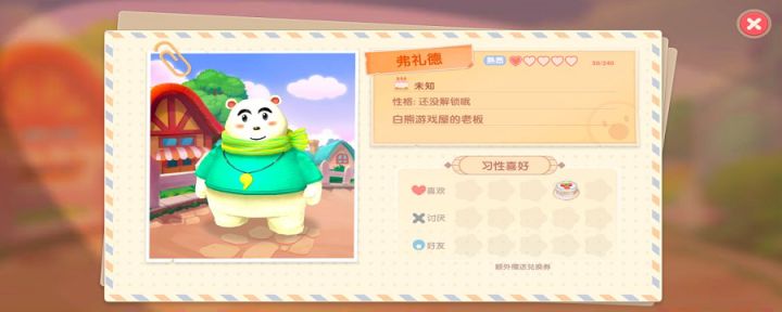 首先前往摩尔城堡,在喷泉的左边,可以发现一个房子。这个非常不起眼的房子就是白熊弗里德的家,直接进去就可以找到弗里德。进入之后和弗里德对话,可以使用白熊兑换券来获取各种有用的物品。习惯喜好喜欢:韵芦、冰川虾、鲶鱼、香煎雪鱼。讨厌:鲤鱼、玉米、香蕉。获取地点葫芦:家园种植。冰川虾:雪山鱼池。鲶鱼:家园池塘、雪山鱼池。香煎雪鱼:餐厅制作日。鲤鱼:家园池塘、雪山鱼池。玉米:家园种植。香蕉:家园特产