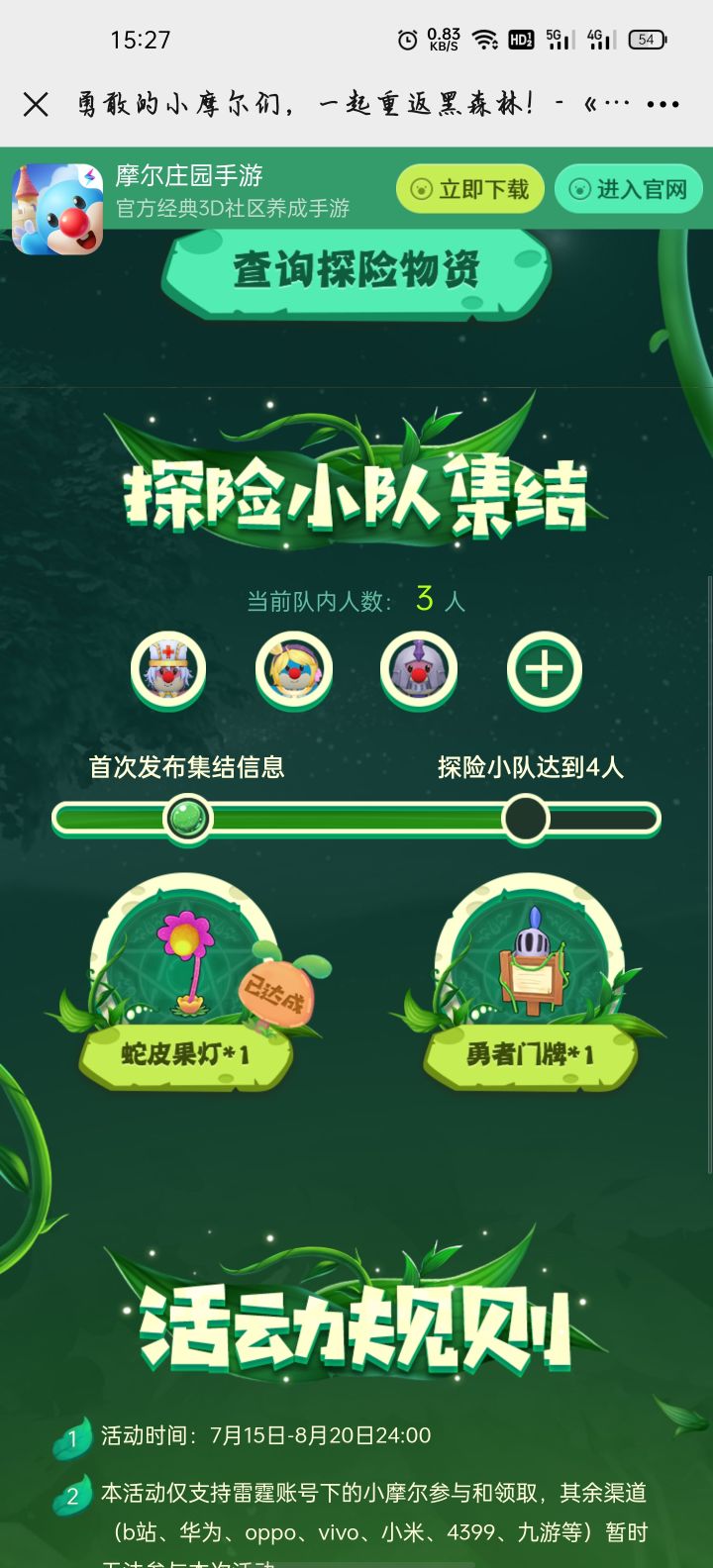 快快快,各位摩尔们,一等三已经一天啦😭赶快加入队伍吧!7月16日,一起重返黑森林!快来加入我的黑森林探险小队,领取探险物资!https://acts.leiting.com/mole/202107/team/?shareId=7c5c7025fe01c3b902cd6655e0ea5001