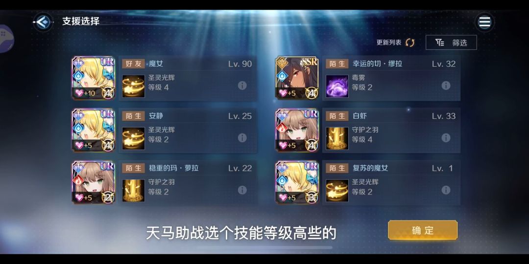天马助战没有好友的,可以点右上角更新列表刷一个出来,视频里用的森女+暗奶+脱解无专武