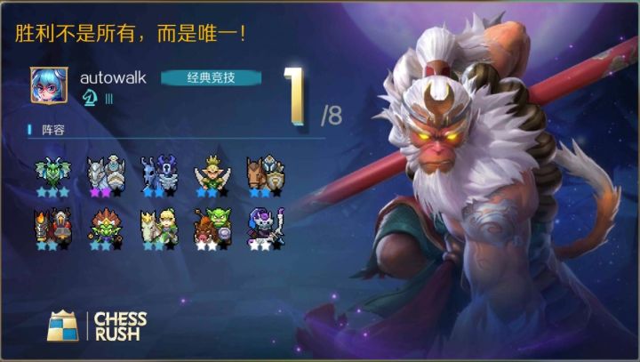 前期是挨打,但尽量减少大出血;中期稳定好4骑士2亡灵1恶魔,然后看手气摸牌。最后终极手气考验就是精灵+猎人那位帅哥能不能组到2星以上,不然只能上生仔蛙。摆阵要保猎人!