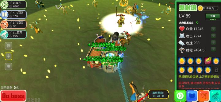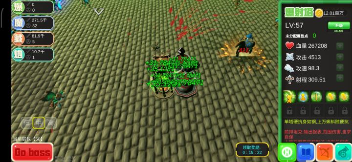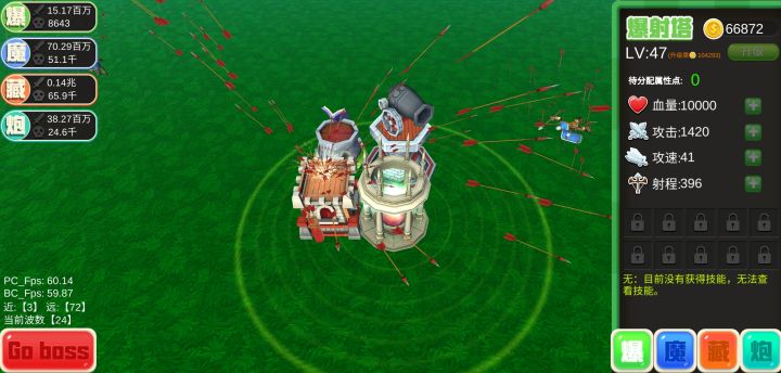 半藏楼全加攻速,带淬毒+散射+强健还能救救,没办法打boss只有他的范围够的着,最强是魔法书,带散射+力量,伤害是弓箭楼的10倍。。。排炮塔一般是闯关用到,全加攻速,带淬毒,爆射塔纯肉就行了,目前的塔平均34级左右。对了塑66和铁66还是卖了好,我用了反倒天赋变差很多,感觉还是攒钻用金六六刷天赋。