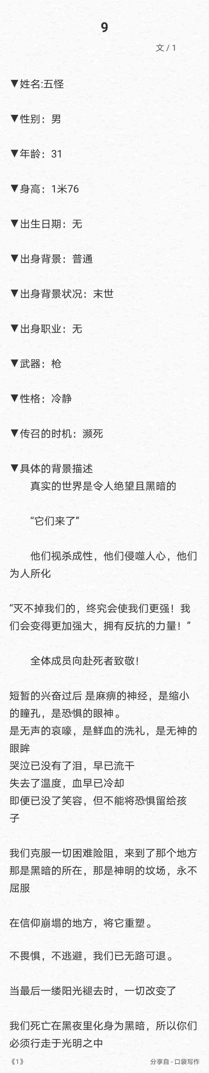 ▼创造者:第五白衣▼姓名:轻羽▼性别:女▼年龄: 16▼身高:165cm▼出生日期:新纪元10年3月12日▼出身背景:科幻末日▼出身背景状况:末日,丧尸纵横,一颗来自遥远星系的陨石,凭借携带的基因数列成功改造了末日,丧尸变异成异能者(部分丧尸直接死亡),有些普通人凭借着它挤身异能者(部分人爆体而亡),原来的异能者直接死亡。秩序重构,原来的丧尸王称霸世界,并修建诺亚,将地球统一,并承诺