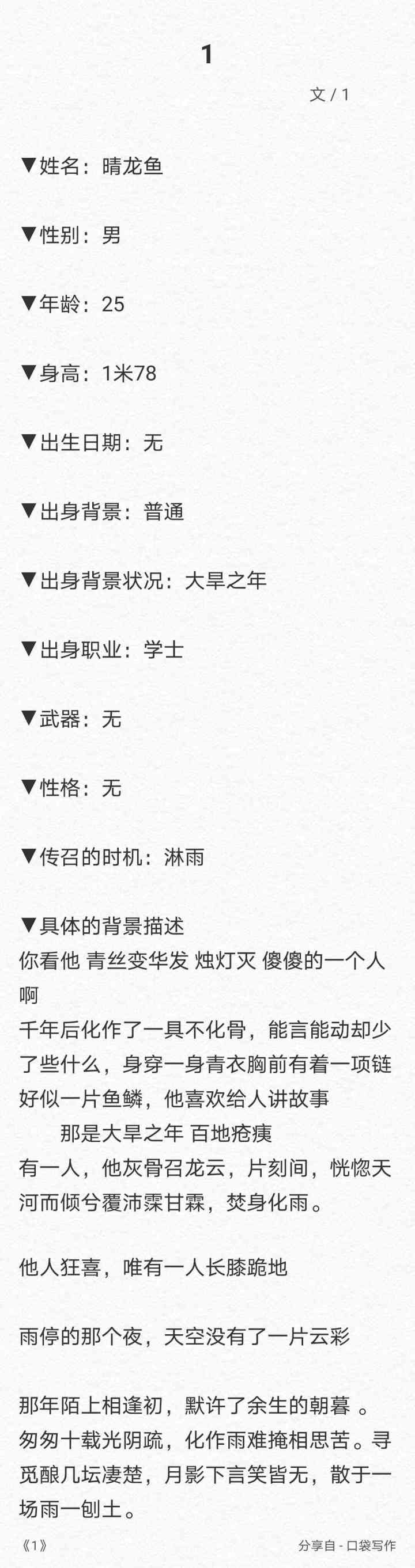 ▼创造者:李洛尘▼姓名:李叙白▼性别:男▼年龄:18▼身高:170 cm▼出生日期:公元2002年四月六号▼出身背景:现代都市▼出身背景状况:盛世▼出身职业:学生,隐藏剑客▼武器:剑▼性格:自卑、懦弱/冷酷,严肃▼被你(玩家)传召的时机:遇到危险时▼具体的背景描述:他是现代都市的一名普通学生,同时也是一名隐藏在繁华都市的一名剑客。他有着严重精神的精神分裂,平时是自卑的大学生