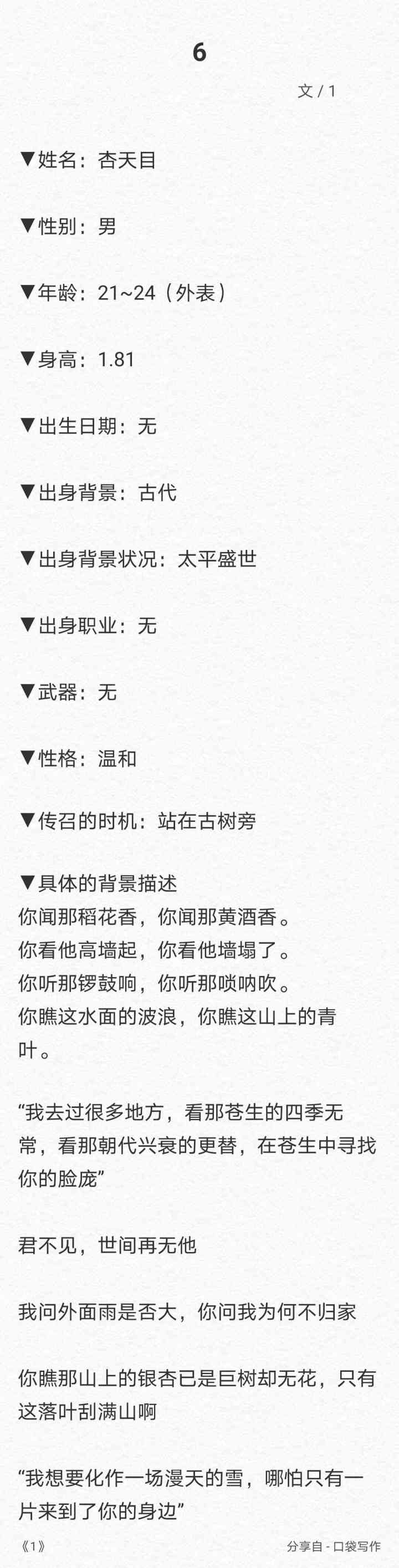 ▼创造者:东君▼姓名:祁凰▼性别:女▼年龄:20▼身高:188▼出生日期:仙历901年正月二十▼出身背景:仙侠世界▼出身背景状况:盛世▼出身职业:仙界大能▼武器:都比较熟悉,但最喜欢用的是剑▼性格:高冷,绝对护短,傲娇,情感缺失▼被你(玩家)传召的时机:睡觉做梦时▼具体的背景描述:她出生在仙门第一家族,天赋异禀但其实她是集天道宠爱化身而来从小便沉浸在修炼的世界中,外界看