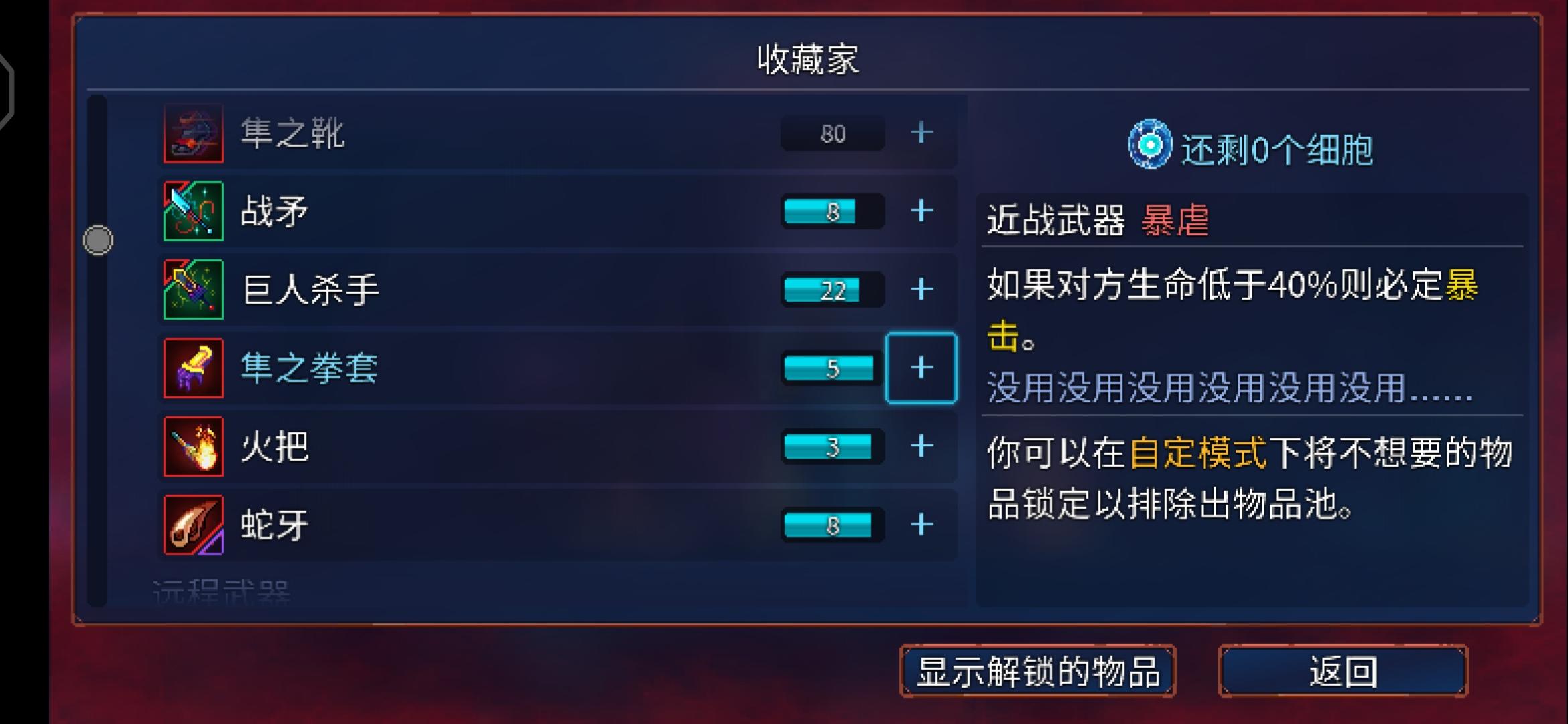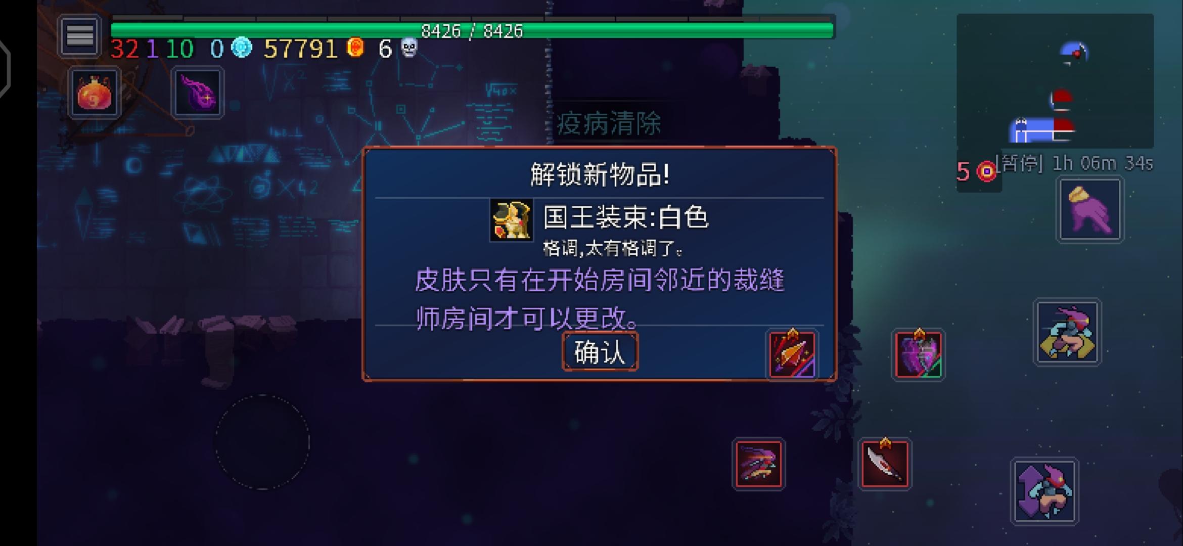 白王了,大概打了有2周,本来可以更快的,结果把存档弄没了,推荐新手不要啥都解锁,因为这样不好捡好武器,去有罪者大道拿一个刺客匕首再拿个位移,几乎是任何细胞通用,然后就图一定要跑完!!诅咒箱也必须开,卷轴尽量点一个,不要三个都点,只点两个!!!(金色武器吃两个卷轴),然后就自己练技术吧