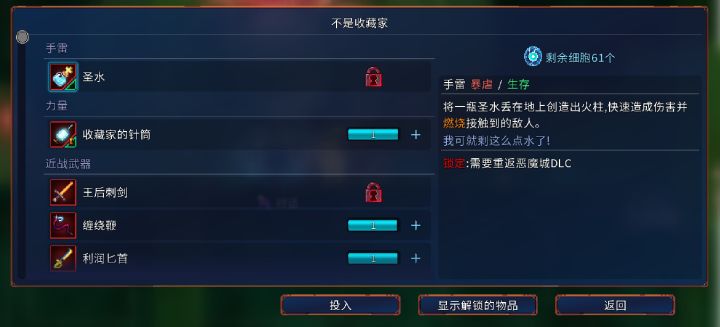 TGA最佳动作游戏《重生细胞》现已开启预约!鏖战、死亡、重生、再战!继PC与主机平台之后,《重生细胞》准备在移动平台开启杀戮!——被囚者的牢房游戏唯一的一级地图,它是每次游戏的起点。入口:游戏入口出口:一个出口通往有罪者的大道,在有罪者的大道拿到藤蔓符文另一个出口获得藤蔓符文后通往猛毒下水道——有罪者的大道入口:被囚者牢房出口:一个出口直接前往壁垒一个出口获得蜘蛛符文后通往监狱