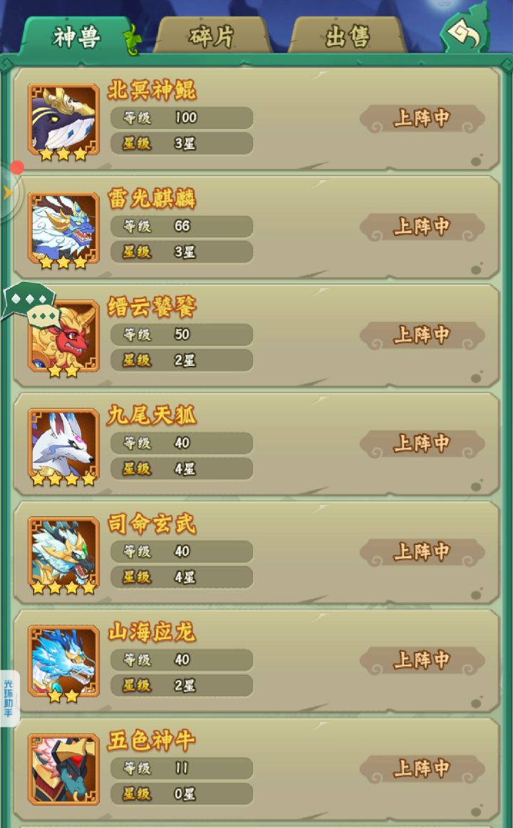主要面向平民或者小氪玩家,比较适合不用四娃和凤凰的玩家,本人常用阵容是1356789,通关玄机妖洞用的是12356789,神兽除了凤凰和白泽,其他都用了(楼主通关时是129级,所以只能上七个神兽)。先说神兽,法宝和娃娃基础神兽星级和法宝星级如下图(仅供参考,越高越好)娃娃打小怪用的是1356789阵容(1235789也行)我的娃娃情况以及作用:金刚【+9.觉4.7.化一】(回怒+抗伤+输