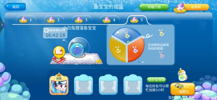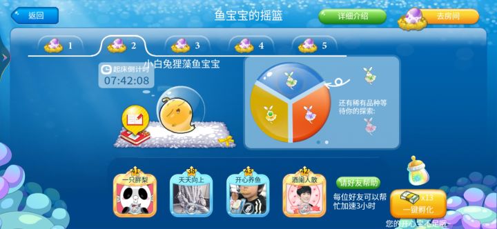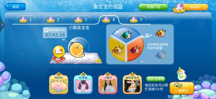 经过浪漫的等待,水族箱中终于迎来了帅气的新郎鱼,来看看葡萄藤下的柔情蜜意,一起过七夕啦~一、葡萄藤目标:获取果篮、锦囊首先去葡萄藤下看一看~点击水壶浇灌葡萄藤使葡萄成熟,点击心愿卡去做任务来填满果篮。收集到果篮后就可以去下一个环节<搭鹊桥>啦。二、搭鹊桥目标:获取爱之翼、锦囊选择一对目标小鱼开始为它们搭建鹊桥,帮助它们成功相聚后可以获得其中鱼儿~拖动葡萄分配给小喜鹊,成功完成鹊桥投