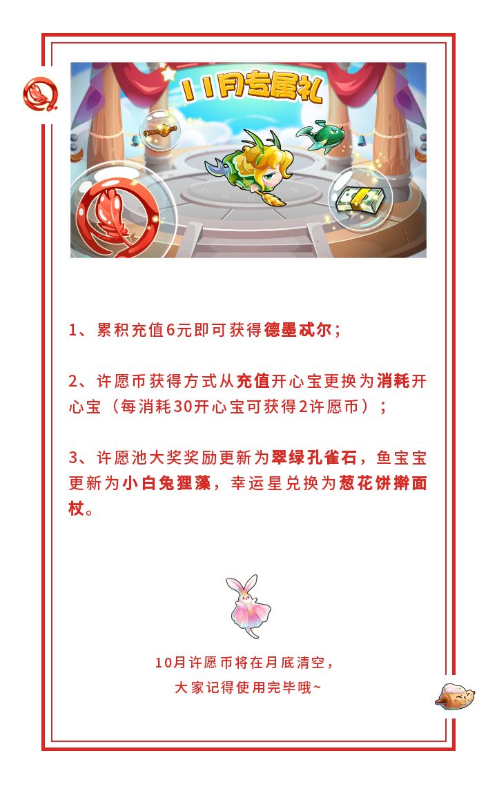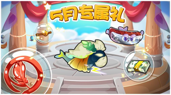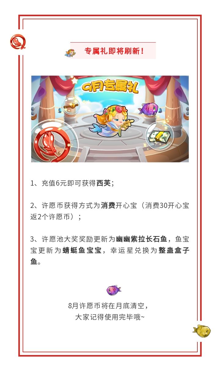 亲爱的鱼友友们~五月一日,专属礼又要更换啦~关于五月专属礼的更新如下:1、进入五月专属礼即可获得充值优惠券,累计充值6元将会获得宙斯~2、五月许愿币获得方式将从充值开心宝换为消耗开心宝~3、许愿池大奖奖励为橄榄绿口琴的好朋友---玫瑰红口琴,鱼宝宝将更换成复古电视机鱼宝宝,幸运星兑换将更换为森绿书屋鱼~关于签到双倍奖励~五月份,签到将获得双倍的奖励,大家在这个月签到不仅可以获得更多开