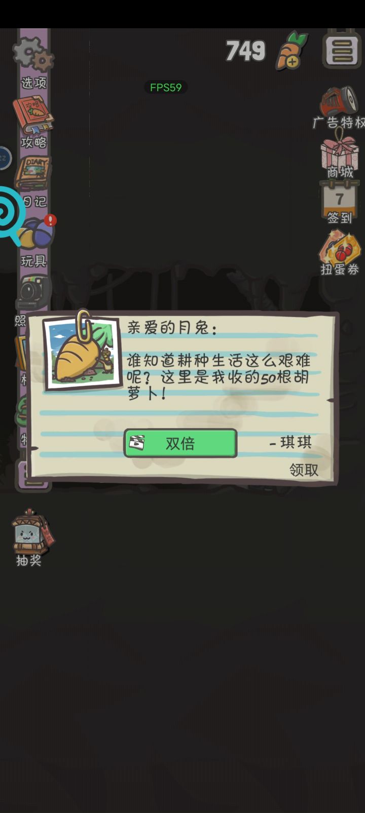 通过更改手机日期就可以来回刷信件,看广告有100🥕,不想看就点右下角领取50🥕,更改日期的话还可以刷签到和❤️好感,如果是改时间就是4小时一次信件,在蘑菇村领自己种的萝卜,两小时一次50🥕