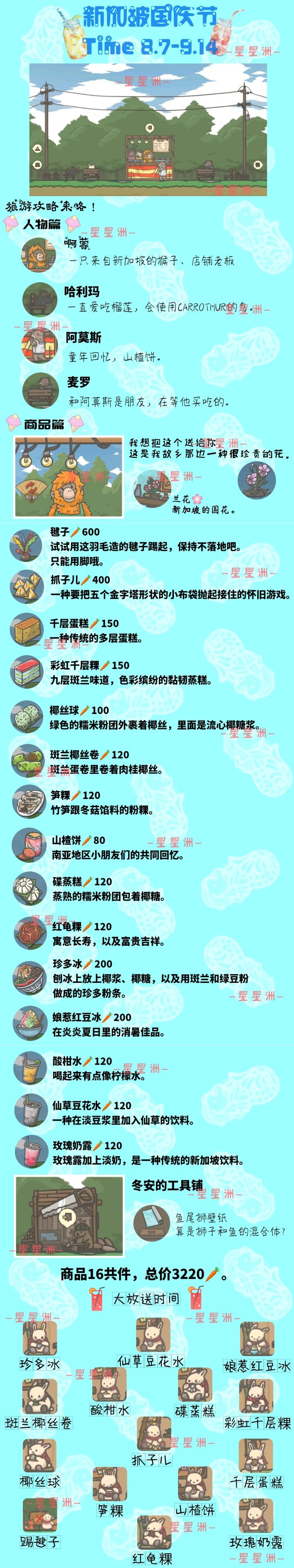 ①特定活动节日均【无日记】②【月亮会员】点击铺主对话送【兰花】🌸③商铺售卖品价格💰毽子→600🥕抓子儿→400🥕千层蛋糕,彩虹千层粿→150🥕椰丝球→100🥕斑兰椰丝卷,笋粿,碟蒸糕,红龟粿→120🥕山楂饼→80🥕酸柑水,仙草豆花水,玫瑰奶露→120🥕娘惹红豆冰,珍多冰→200🥕共16件商品,总价2720🥕④【冬安工具铺】更新壁纸×1:鱼尾狮壁纸🐟🦁💰500🥕